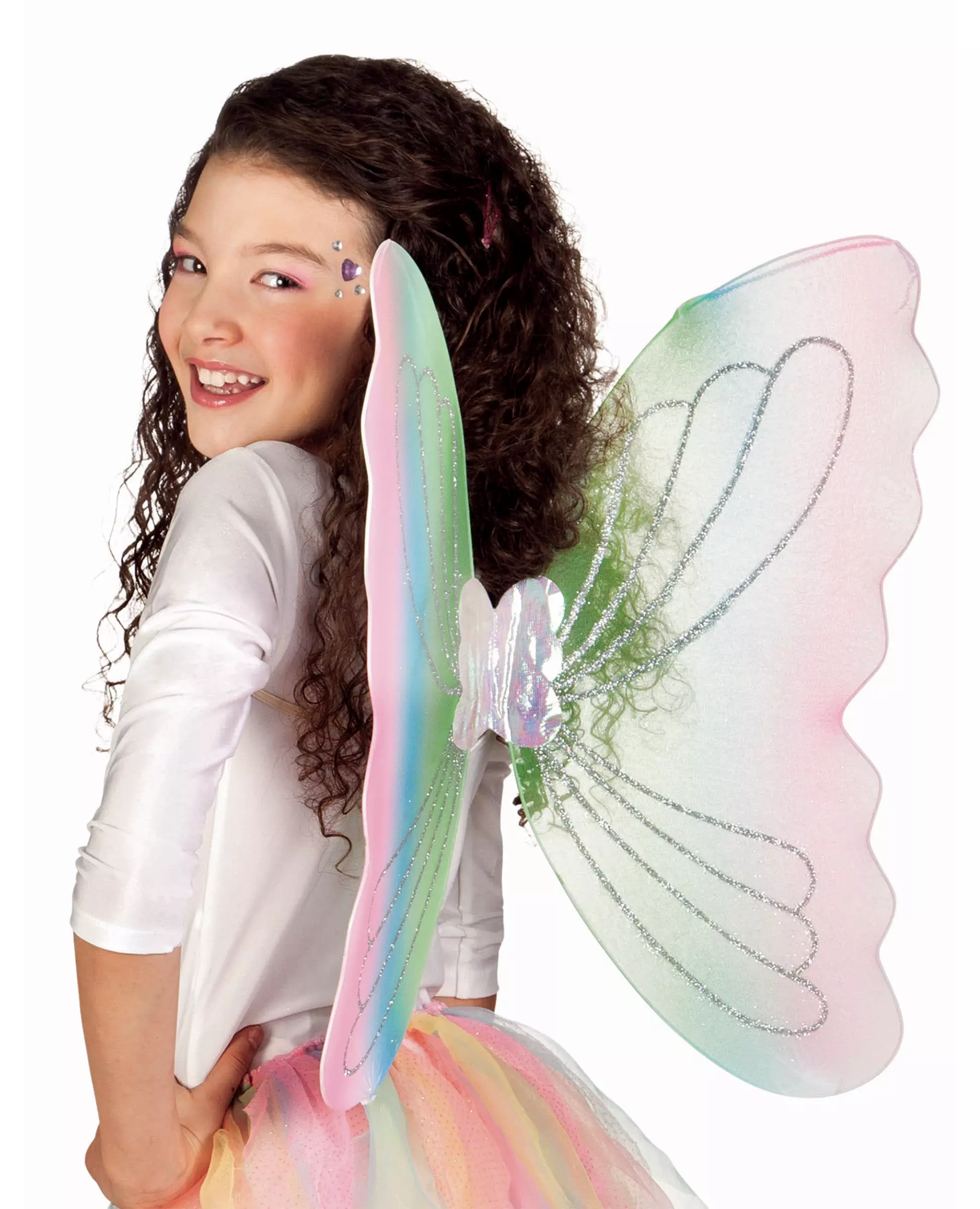 Et snev av farge! Dette paret med sommerfuglvinger har en fin fargegradient som spenner fra grønt til rosa, og har også strikk for god støtte på ryggen. Når vingene er åpnet, måler de omtrent 56 cm x 46 cm. Dette tilbehøret er ideelt for å fullføre antrekket ditt på et kostymearrangement som karneval eller en temafest. Inkludert tilbehør: Par vinger