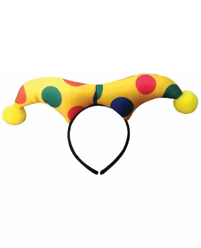 Bli en klovn på karnevalet Dette pannebåndet for voksne er svart. Det er dekorert med et harlekinhodeplagg. Dette er gult med flerfargede prikker. Det har to spisser som går til siden, med en gul pompong i enden. Dette pannebåndet vil være perfekt for å fullføre et klovne- eller harlekinkostyme til karnevalet. Inkludert tilbehør: Pannebånd