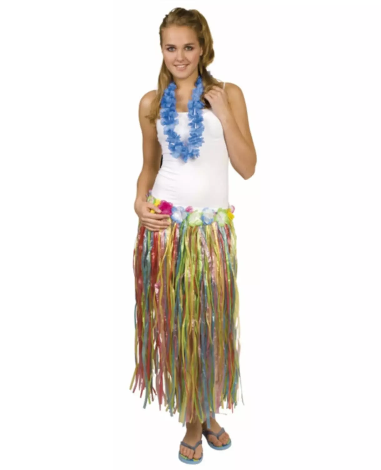 Et skjørt som vil bringe farge til festen din! Dette hawaiiske skjørtet er for kvinner (selges enkeltvis). Det er laget av plast og måler 80 cm langt. Det har elastikk i midjen for bedre komfort. Dette flerfargede frynseskjørtet har et blomsterbelte i midjen. Det vil være ideelt som et supplement til et hawaiisk kostyme for en eksotisk kveld eller en strandfest! Inkludert tilbehør: Skjørt Materiale: Plast
