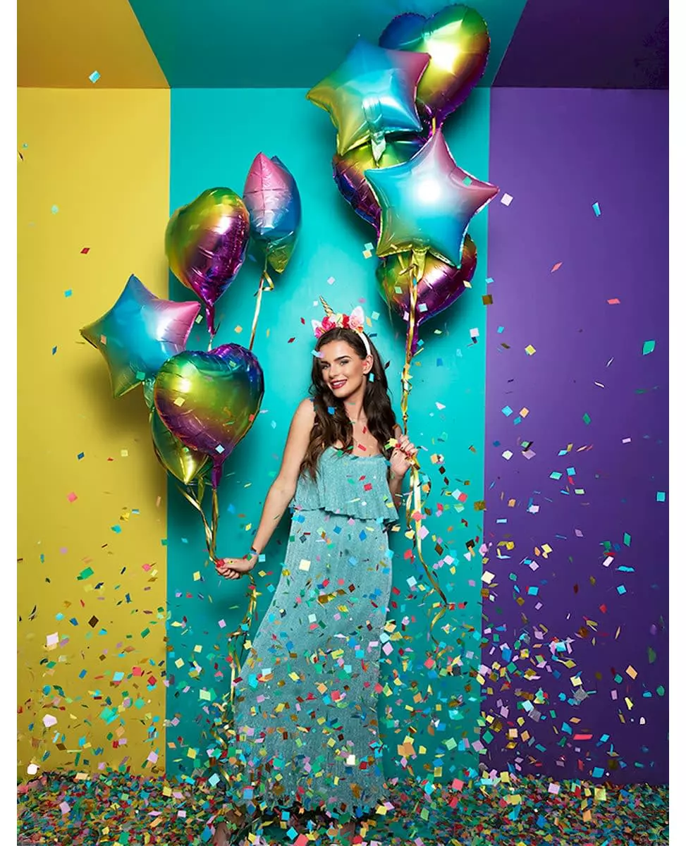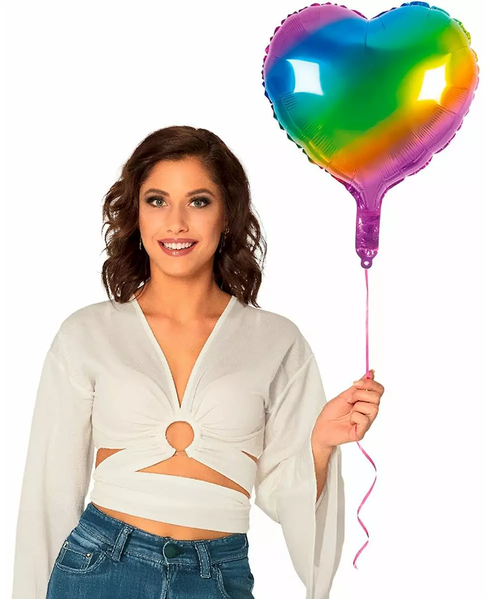 En regnbuedekorasjon! Denne flerfargede hjertefolieballongen måler omtrent 45 cm. Med et flerfarget utseende overalt er denne ballongen hjerteformet. Den kan blåses opp med luft ved hjelp av en ballongpumpe eller helium slik at den svever i luften! Velg en flerfarget dekorasjon til temafesten din, for eksempel til nyttårsaften eller karneval! . Inkludert tilbehør: 1 ballong Materiale: Aluminium Stell: Ikke vask
