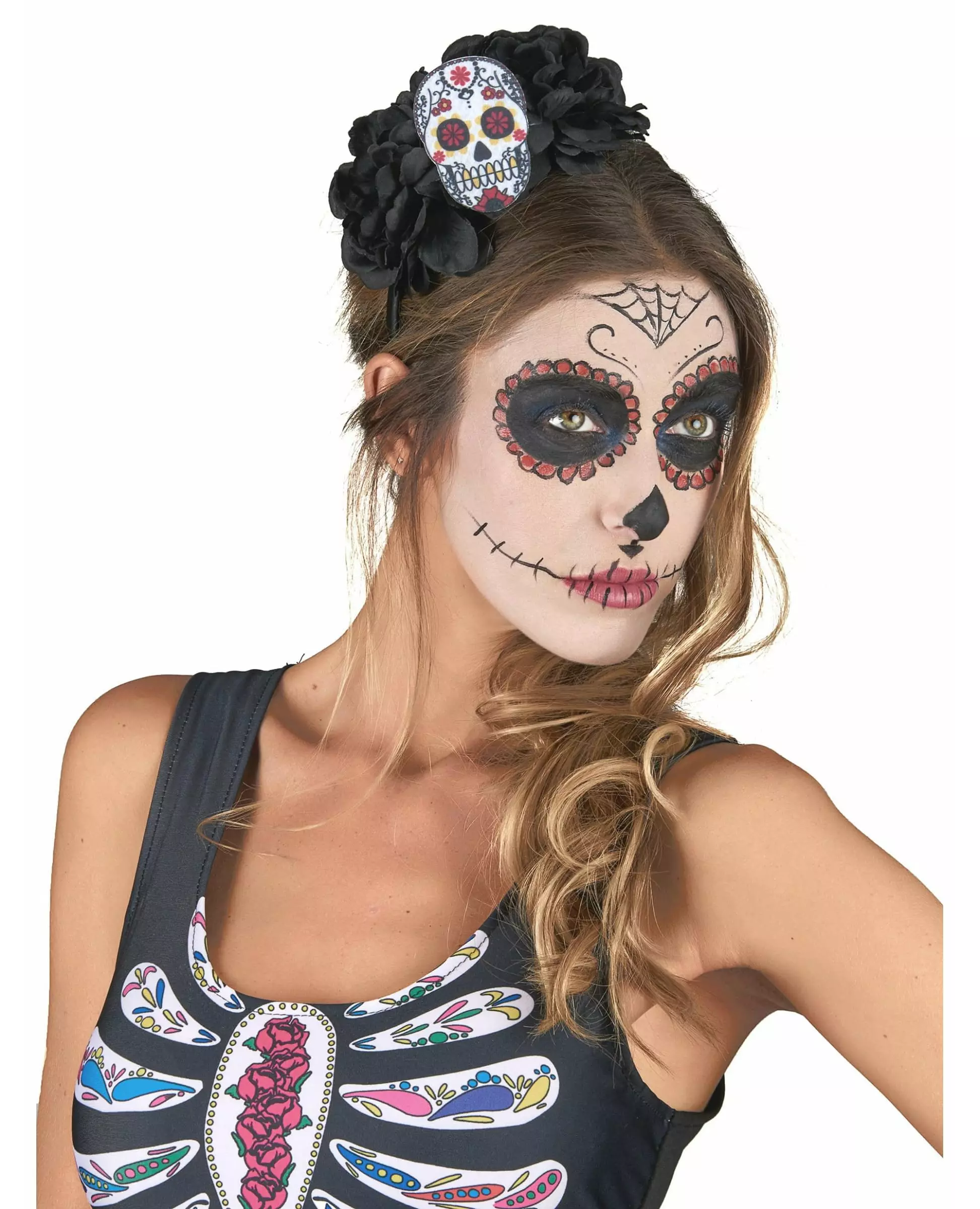 Blomsterhodeplagg Dette Dia De Los Muertos-pannebåndet for voksne er fleksibelt og passer alle hoder. To svarte roser topper hodeplagget, og en typisk calavera fra de dødes dag er plassert mellom de to blomstene. Dette pannebåndet vil perfekt dekorere håret ditt, enten det er bundet opp eller ned, under en temafest eller på Halloween-kvelden. Inkludert tilbehør: Pannebånd Materiale: Polyester og plast