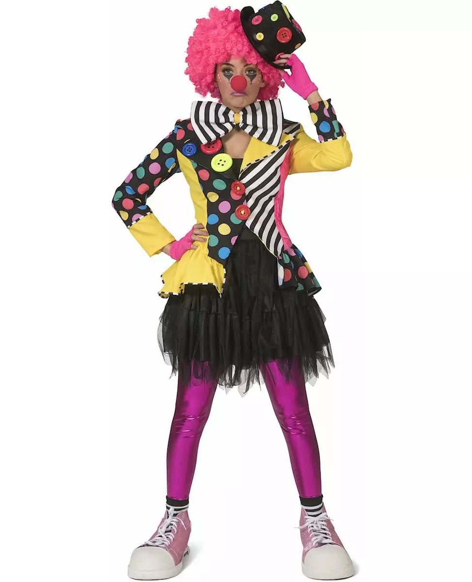 Gi klovnekostymet ditt litt ekstra pep. Denne klovnejakken for kvinner er laget av forskjellige stoffer (kun jakken er inkludert). Jakken kommer i gult, rosa med pels, svarte og hvite striper eller svart med flerfargede prikker. Store fargede knapper er på slaget. Bak er jakken lengre og ender i en spiss. Jakken har en gigantisk sløyfe. Den har svarte og hvite striper. Denne fargerike jakken vil være perfekt for å fullføre klovnekostymet ditt til karneval. Inkludert tilbehør: Jakke Sløyfe Materiale: 100 % polyester Vedlikehold: Håndvask