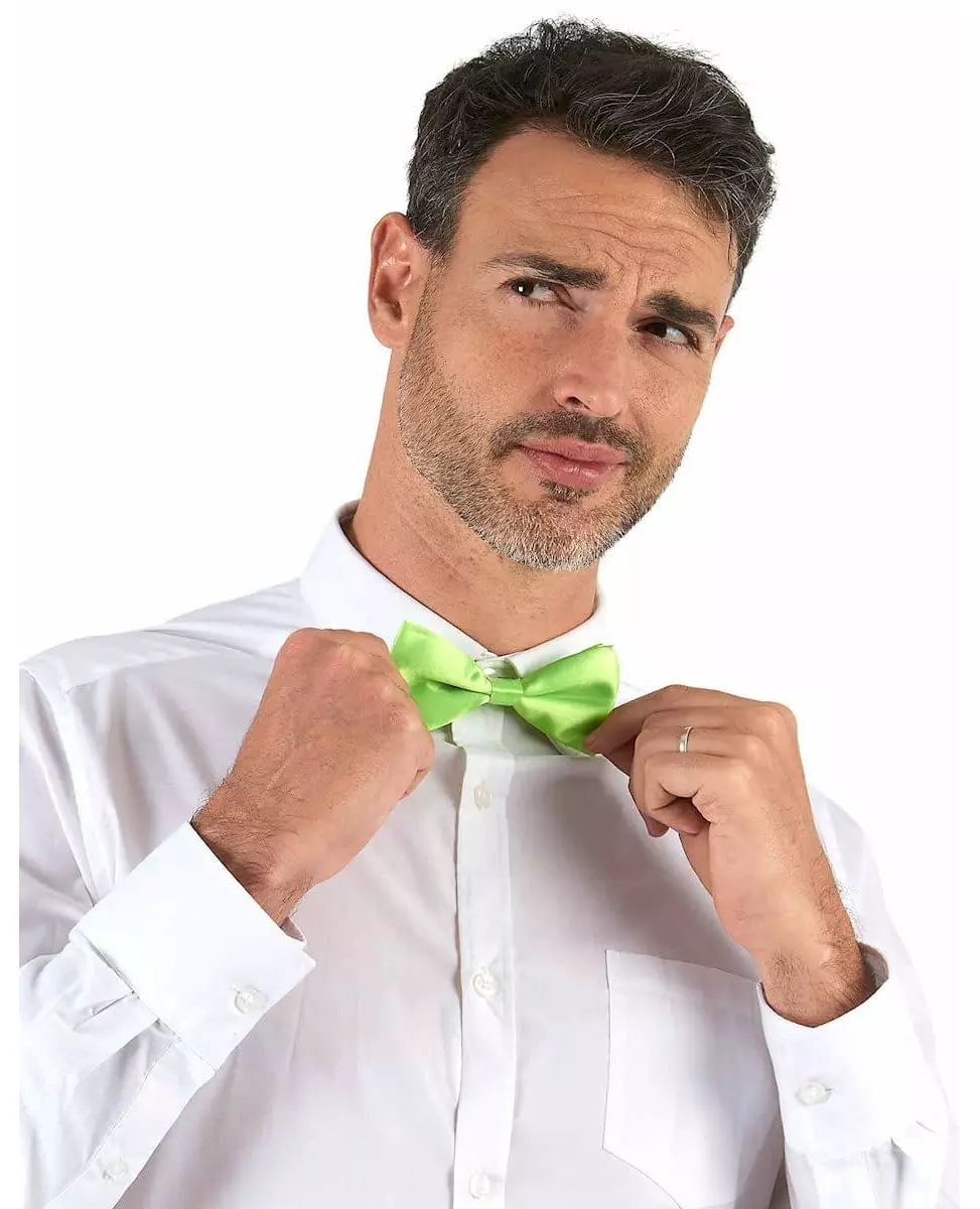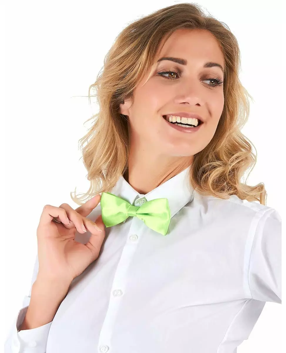 Legg til litt farge og klasse til antrekket ditt. Denne sløyfen for voksne er laget av neongrønt satengstoff. Den måler omtrent 12 x 6,5 cm. Denne sløyfen holdes rundt halsen med en krok. Den har også en justerbar halsstropp. Denne grønne sløyfen vil være perfekt for å gi dressen din et fargerikt preg. Inkludert tilbehør: Sløyfe