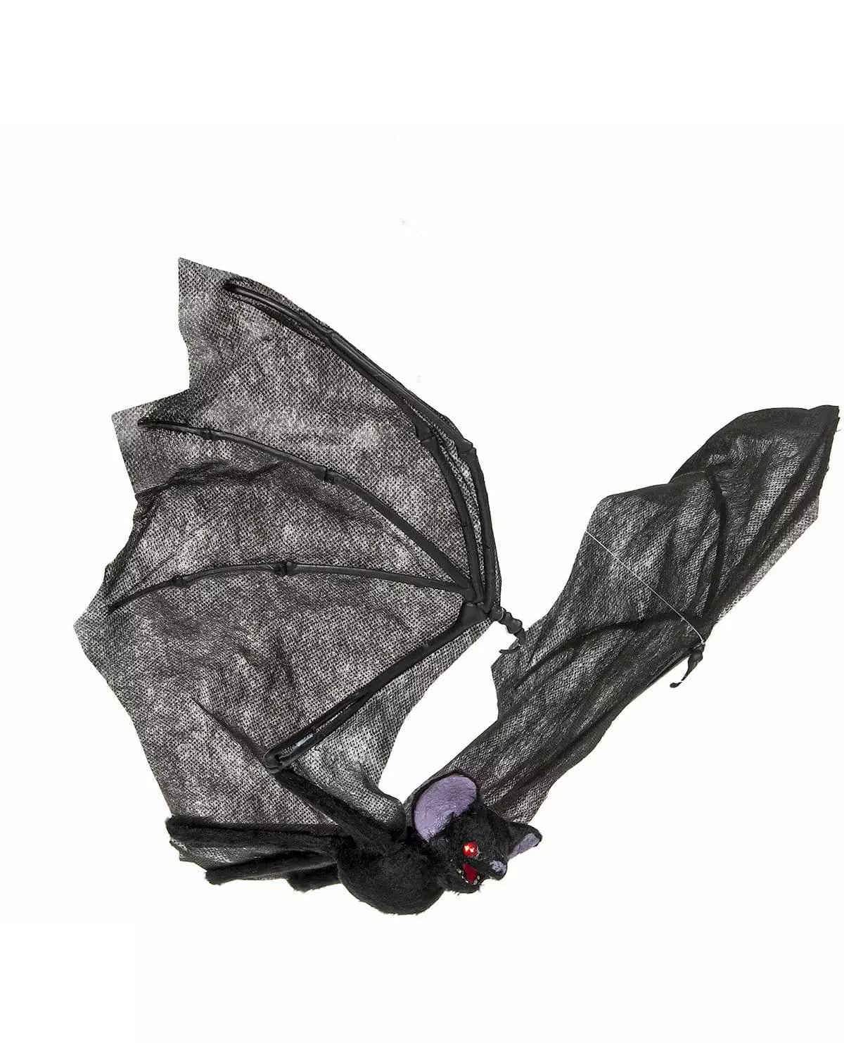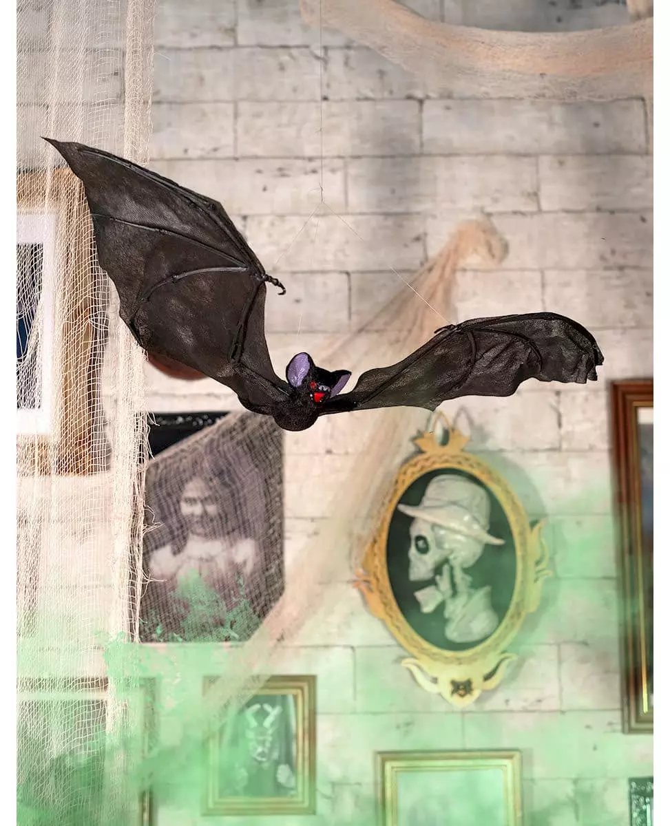 Med røde øyne! Denne flaggermusen leveres med tre gjennomsiktige plasttråder slik at du kan henge den opp. Den måler omtrent 50 cm bred og 18 cm lang. Svært realistisk, den er ideell for å dekorere både interiøret og eksteriøret under Halloween-festene dine. Inkludert tilbehør: 1 flaggermus