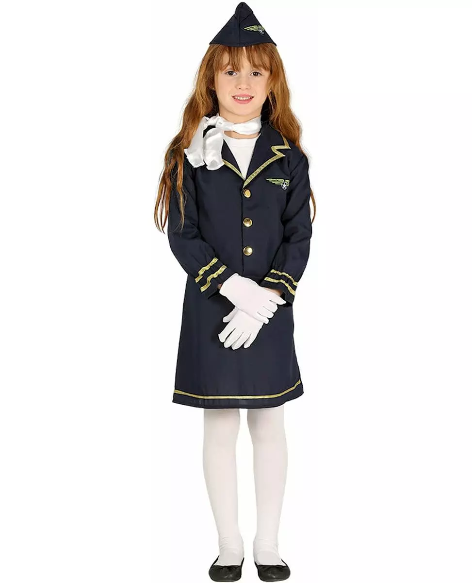 Med dette flyvertinnekostymet, ingen bløff pas for karnevalet. Dette flyvertinnekostymet for barn består av en kjole og en hatt (skjerf, strømpebukser, hansker og sko er ikke inkludert). Den korte kjolen er dekorert med en pen gullflette. En falsk gullknapping er plassert foran for å gi antrekket et elegant preg. En flyvertinnehatt fullfører kostymet. Et lite merke er sydd på siden. Dette kostymet vil være perfekt for datteren din når hun skal fly til karnevalet. Inkludert tilbehør: Dresshatt Materiale: 100 % polyester Stell: Håndvask