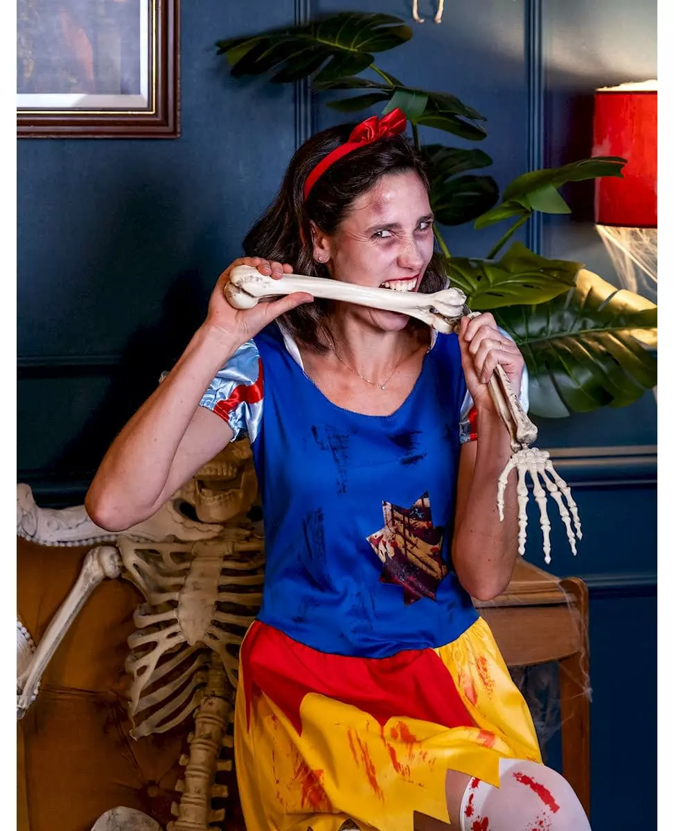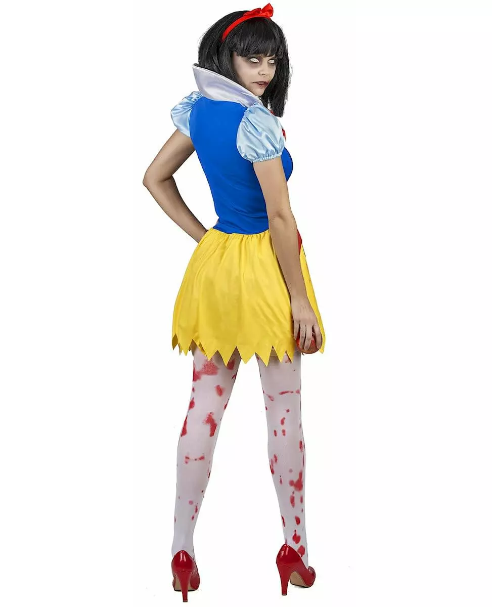 Du skulle ikke ha bitt i eplet. Dette forgiftede prinsessekostymet er for kvinner og inkluderer en kjole og et hodeplagg. Kjolen har puffermer, er kort og har en blodhvit skumkrage. Bysten er laget av fint kongeblått stoff, og skjørtedelen, gul og rød, har et filtfôr for å gi helheten fylde. Pannebåndet er rødt og toppet med en liten sløyfe i samme farge. Hele kjolen, i en vakker gørr-effekt, er sprutet med falskt blod og vil være perfekt for å spille originalitetskortet på Halloween-festen din!. Inkludert tilbehør: Kjolepannebånd Materiale: 100 % polyester Stell: Håndvaskbar