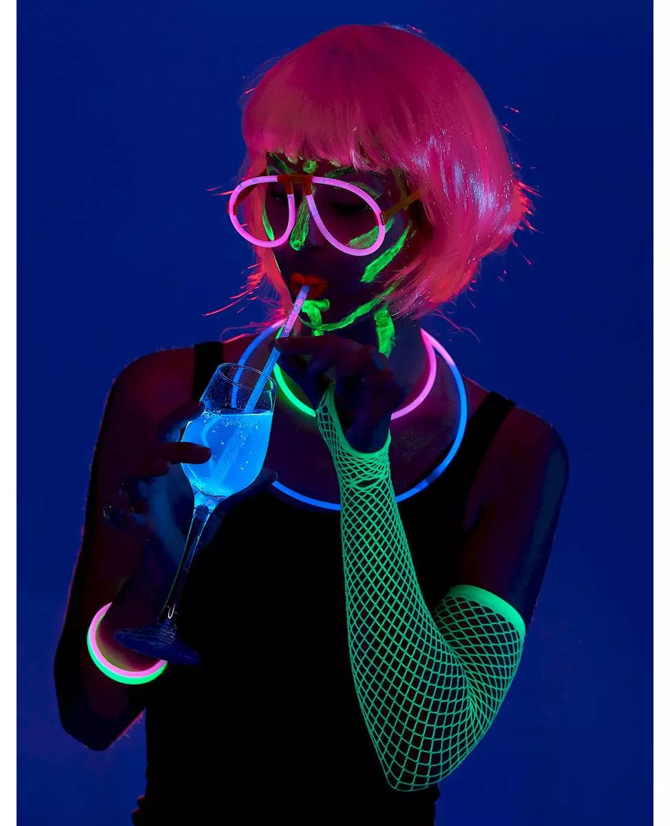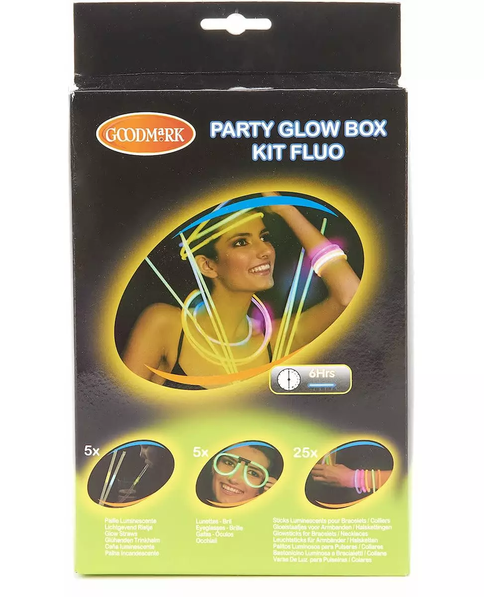 Skinn sterkt på din neste fest Dette settet med fosforescerende tilbehør lar deg utstyre 5 personer. Faktisk kan 25 fargede fosforescerende rør på 20 cm monteres i armbånd ved hjelp av de små rørene som følger med for dette formålet. 10 gule plastgrener lar deg, sammen med de 10 andre fosforescerende rørene, lage glass som lyser i mørket. Til slutt lar 5 stive plastsugerør med små fosforescerende rør deg drikke cocktails på en original og morsom måte. Disse fosforescerende gjenstandene vil lyse i omtrent 6 timer. Dette settet vil være perfekt for å lyse opp en kveld på et diskotek eller en utendørsfestival. Inkludert tilbehør: 35 fosforescerende rør 25 låser 10 glassstenger 5 klips for midten av glassene 5 sugerør