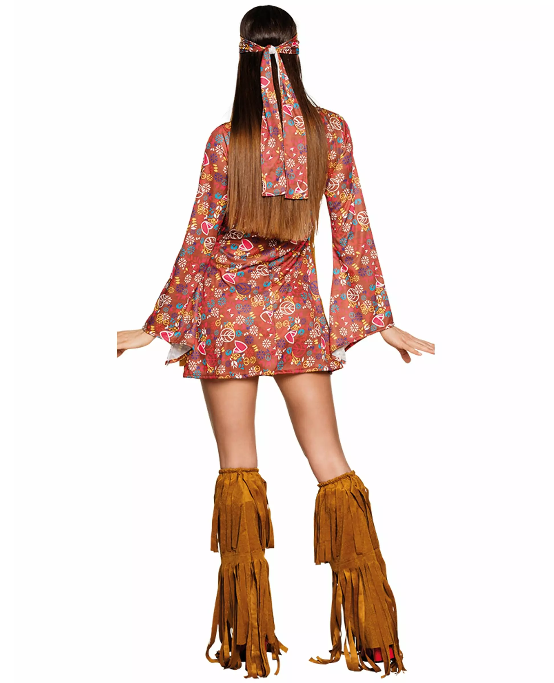 Sommeren av kjærlighet! Dette hippiekostymet for kvinner består av en kjole, en vest, et pannebånd og støveltrekk. Den korte kjolen gir illusjonen av å ha på seg en brun frynsete vest med Fred og Kjærlighet-symbolet og ordene «FRED» under. Kjolen har et blomstertrykk i høstfarger med lange, utsvingte ermer. Pannebåndet matcher kjolen, og de brune frynsete støveltrekkene ser ut til å være laget av brunt semsket skinn som vesten. Bli en pen hippie til ditt neste 60-talls kostymefest eller karneval. Inkludert tilbehør: Kjole, Vest, Pannebånd, Støvletter Materiale: 100 % polyester, 100 % polyester, 100 % polyester, 100 % polyester, 100 % polyester, 100 % polyester