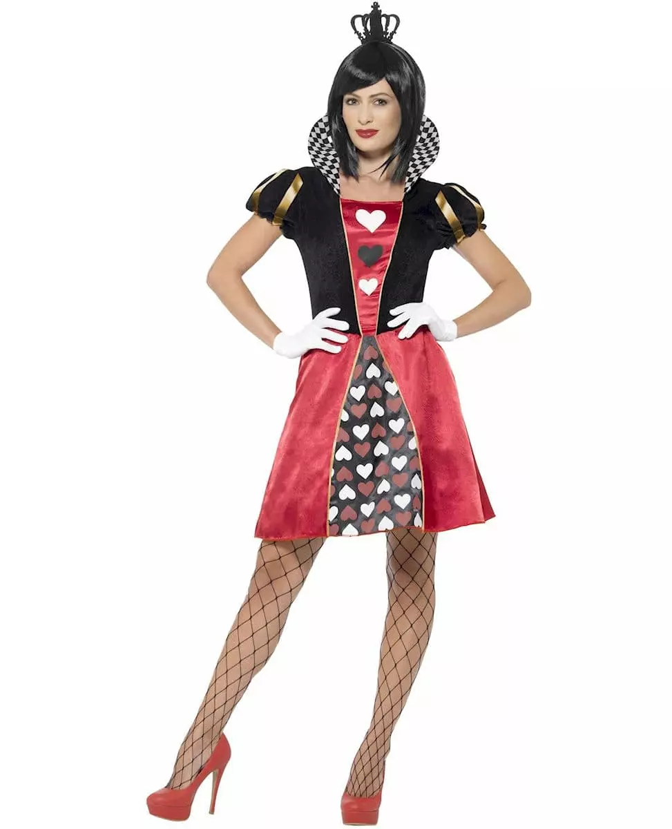 Gjør klar kortstokken din! Dette Miss Queen of Cards-kostymet for kvinner består av en kjole, et par hansker og et pannebånd. Kjolens overdel er laget av svart fløyelsstoff med en rød satengdekorasjon utsmykket med svarte og hvite hjerter og en gullkant. De korte puffermene er dekorert med gullbånd. Den svarte og hvite rutete kragen er laget av skum for å stå rett. Den nederste delen av kjolen er laget av rødt satengstoff med en svart dekorasjon utsmykket med røde og hvite hjerter og en gullkant. Svart tyll er plassert under skjørtet for å skape volum. Kjolen lukkes bak med glidelås. De ensfargede hvite hanskene er korte. Det svarte plastpannebåndet er toppet med en svart filtkrone. Dette kostymet vil være ideelt for å spille kortdronning på et karneval eller en utkledningsfest!. Inkludert tilbehør: Kjole 2 hansker Pannebånd Materiale: 100 % polyester Vedlikehold: Håndvask
