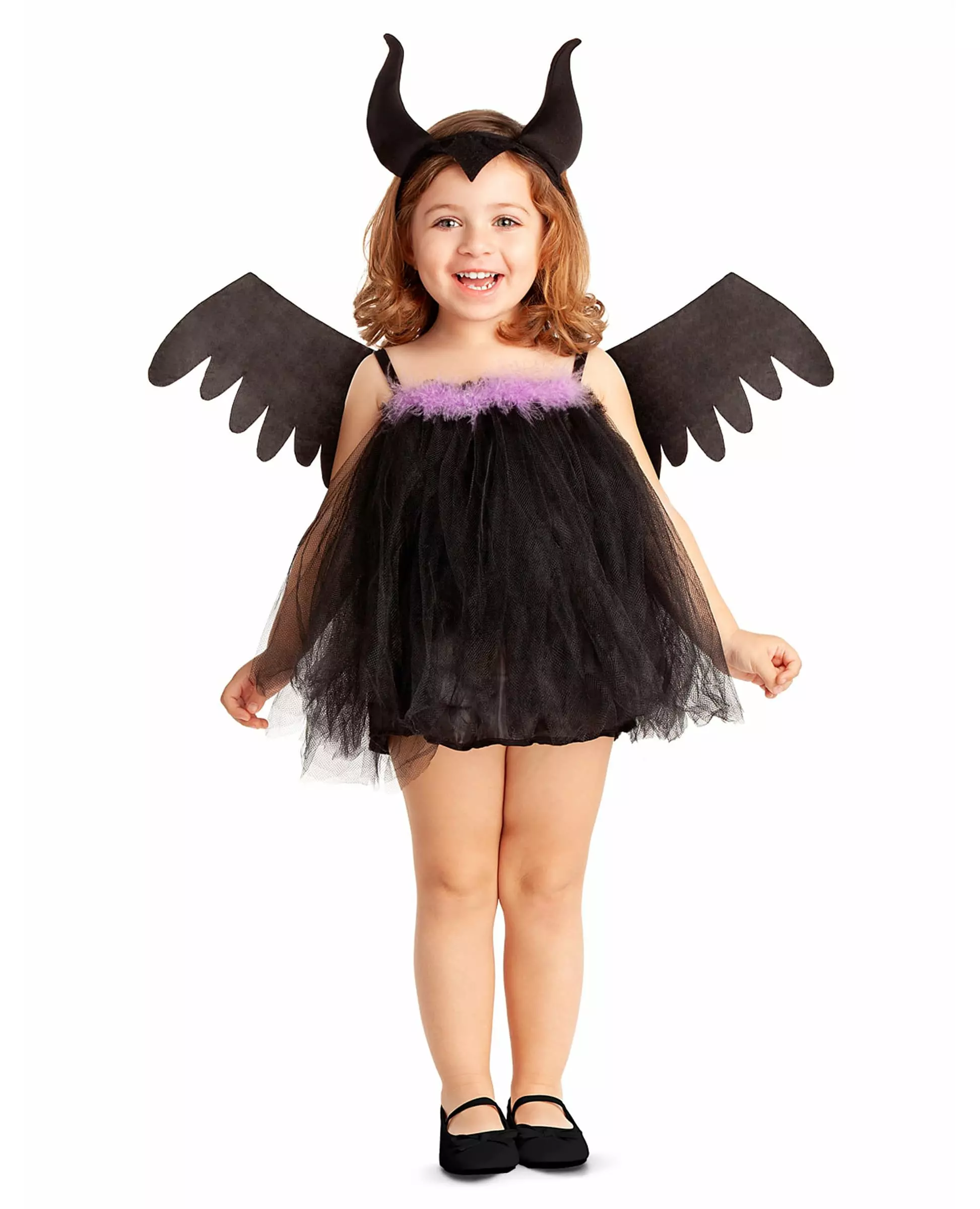 Feir Halloween med familien med et kostyme til den lille. Dette onde dronningkostymet for babyer består av en tunika, et pannebånd og et par vinger (sko ikke inkludert). Den korte tunikaen er svart med tyll over. Halsutringningen er avgrenset av en lilla fjærkant. Vingene er svarte og kuttet i avrundede former. Ansemblet fullføres av et svart hodeplagg som representerer to horn og en spiss som går ned på pannen. Dette kostymet vil være perfekt for å feire Halloween. Inkludert tilbehør: Tunika Vinger Hodeplagg Materiale: 100 % polyester Vedlikehold: Håndvask