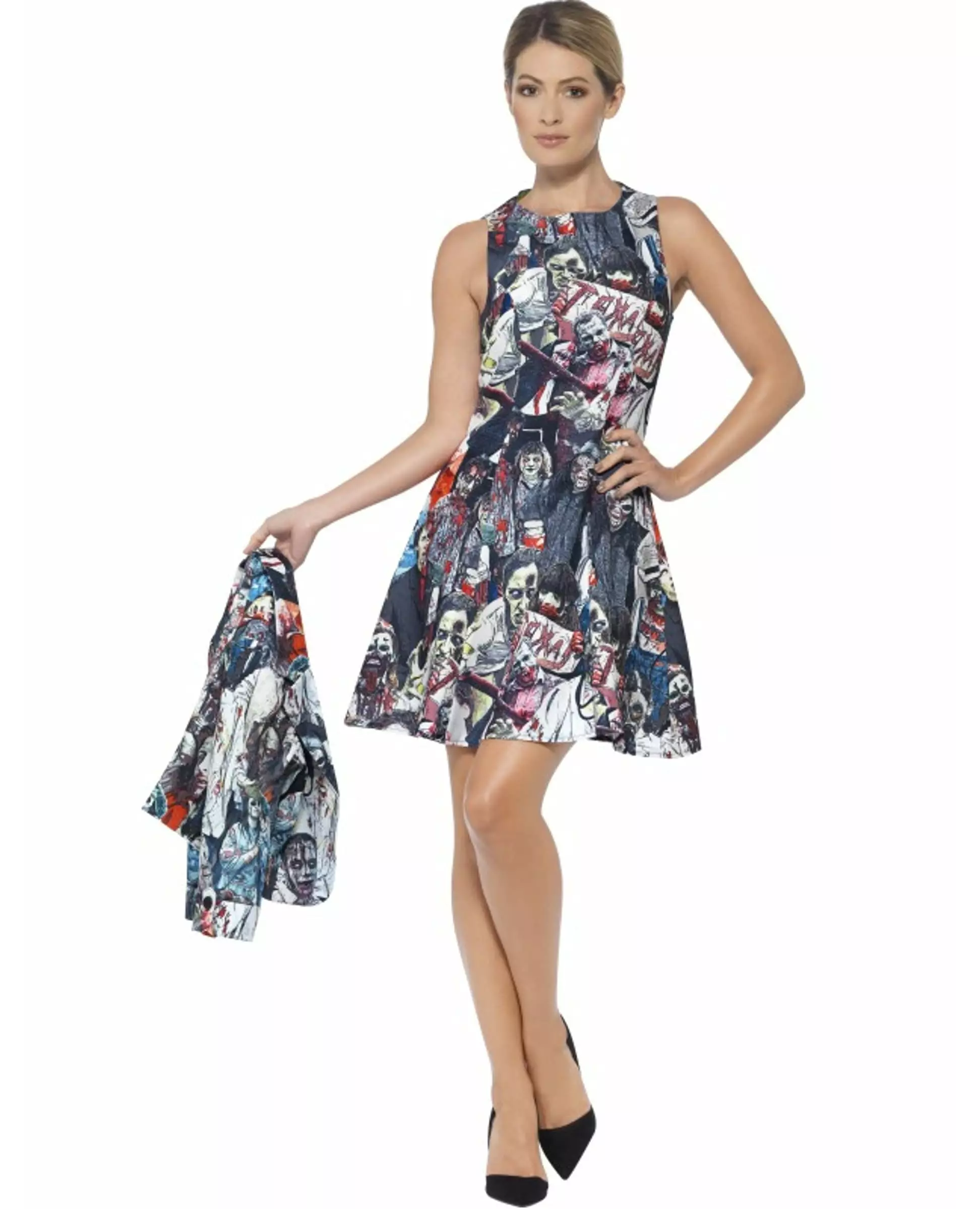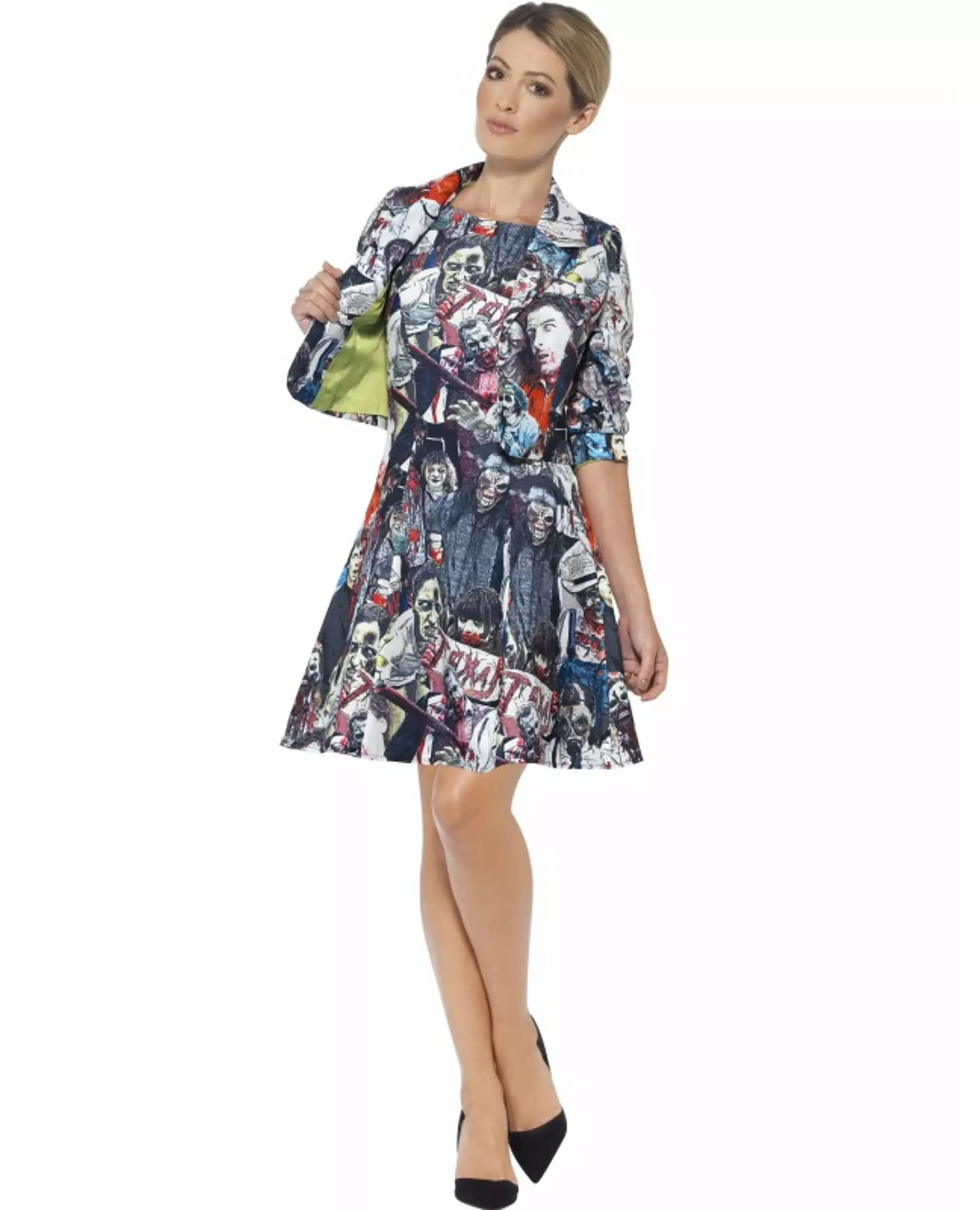 Når skrekk blir elegant! Dette Mrs. Zombie-kostymet for kvinner består av en kjole og en jakke (veske og sko er ikke inkludert). Hele antrekket er trykt med zombier. Kjolen er kort og utsvingt nederst. Den har brede stropper. Jakken er kort og har mellomlange ermer. Bytt ut Halloween-kostymet ditt med dette elegante kostymet og overrask vennene dine! Inkludert tilbehør: Jakke Kjole Materiale: 100 % polyester Pleie: Håndvask