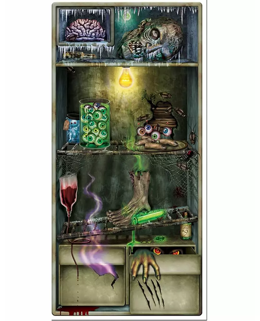 Dørdekorasjon som representerer innsiden av et kjøleskap med hjerne, øyne, en blodpose ... og måler 76,2 cm x 1,52 m. Den vil være ideell for å pynte opp enhver dør på Halloween-kvelden. Inkludert tilbehør: dørdekorasjon