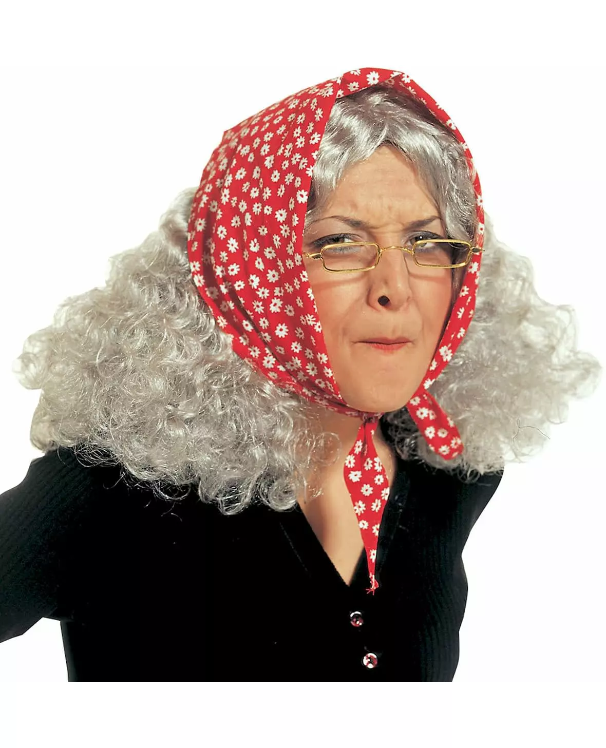 Grått hår! Denne grå parykken for gamle kvinner har et bølget, krølltoppklipp med skjerf. Den settes på med et elastisk nett. Denne parykken kan utfylle et bredt utvalg av kostymer på temafestene dine. «Copyright Widmann SRL». «Copyright Widmann SRL. Materiale: 100 % polyester