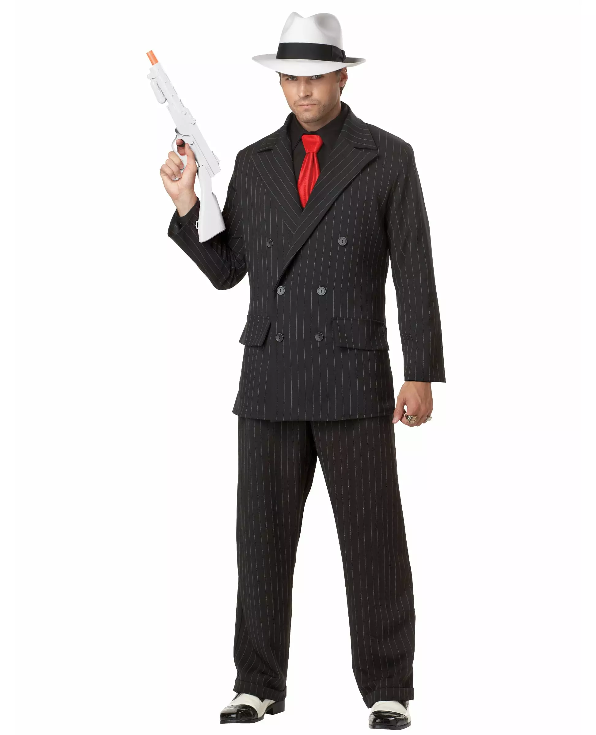 Forvandle deg til en ekte gangster! Dette gangsterkostymet for menn inkluderer en jakke, bukser, en skjorte med slips og bukseseler (hatt, sko og våpen er ikke inkludert). Jakken er svart med hvite striper. Den har falske lommer sydd foran, og knapper for enkel lukking. Ermene er lange og puffete på skuldrene. De matchende buksene er vide og elastikk i midjen for økt komfort. Skjorten er svart med lange ermer. Den har borrelåskrage for enkel påkledning, og et rødt slips er sydd foran. Til slutt setter hvite bukseseler prikken over i-en til antrekket. Dette kostymet vil være perfekt for å spille en ekte gangster på en utkledningsfest med venner. Inkludert tilbehør: Jakke Bukser Skjorte med slips Bukseseler Materiale: 100 % polyester Vedlikehold: Håndvask Målinformasjon: For størrelse XL, jakke ca. 79 cm lang, topp ca. 65 cm lang og bukser ca. 98 cm lange