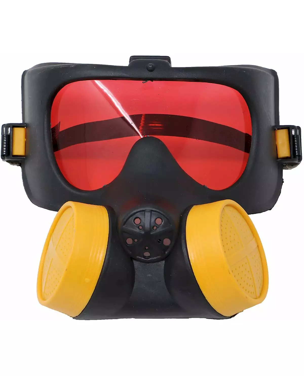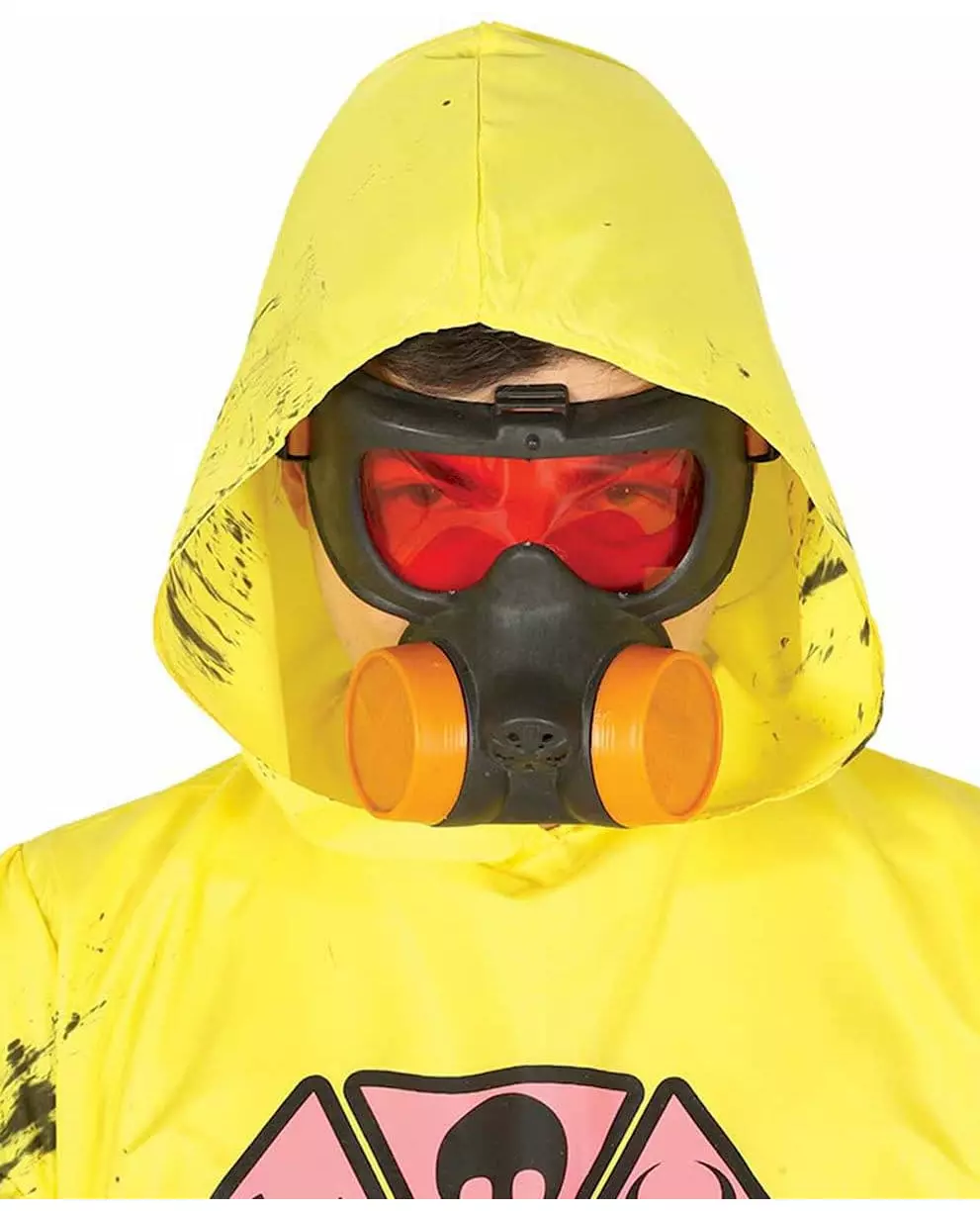 Motstå verdens undergang med denne gassmasken for voksne! Denne gassmasken er for voksne (den gule fengselsdressen er ikke inkludert). Masken er svart med et rødt visir og to oransje åndedrettsvern. Et hodeskallemotiv er synlig på midten av masken mellom de to åndedrettsvernene. Denne masken vil være perfekt for å fullføre antrekket ditt for en overlevelses- eller verdens undergang-temafest. Inkludert tilbehør: Maske