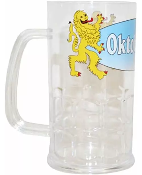Viktig til Oktoberfest! Dette plastglasset måler 14 cm. Det er et trykk på toppen av glasset med to gule løver. Glasset har en kapasitet på omtrent 50 cl. Dette ølkruset vil være perfekt til den berømte Oktoberfesten!. Materiale: Plast Vedlikehold: Håndvask
