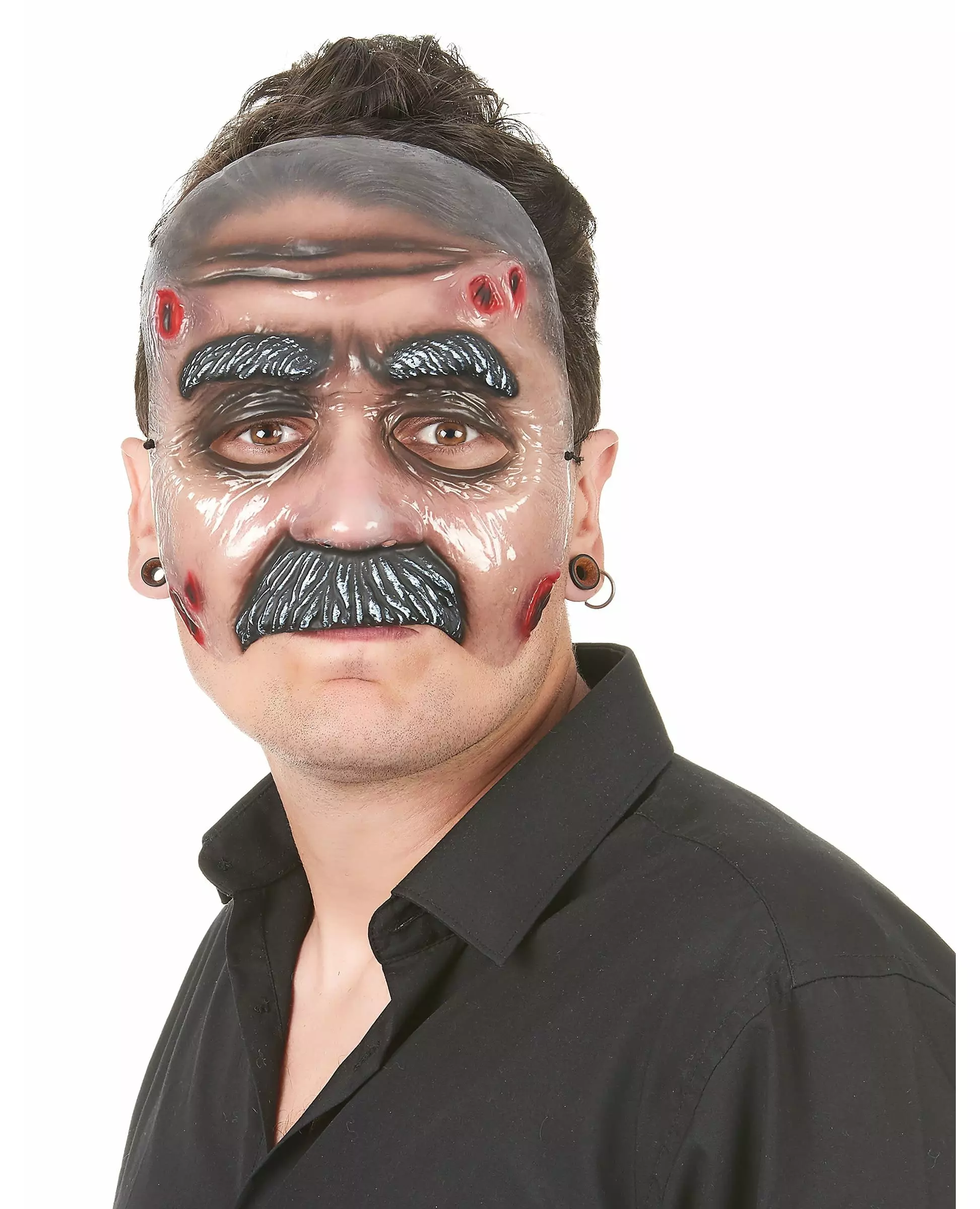 Du som drømte om en bart! Gjennomsiktig halvmaske i plast for voksne, som viser ansiktet til en gammel mann med bart og store, grånende, svarte øyenbryn. Den gamle mannens ansikt har også skader som kulehull. Den festes til ansiktet ditt med en strikk. Masken går ned til toppen av munnen din og lar bunnen av ansiktet ditt være udekket. Ideell for å være inkognito på en kostymefest!. Inkludert tilbehør: Halvmaske Materiale: Plast