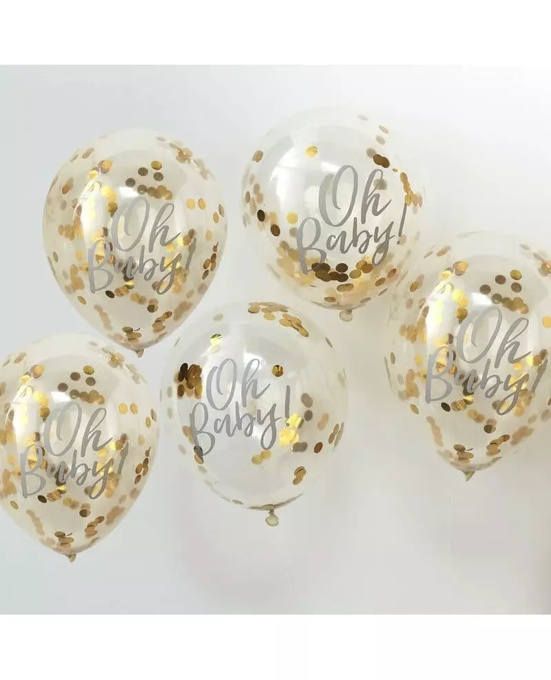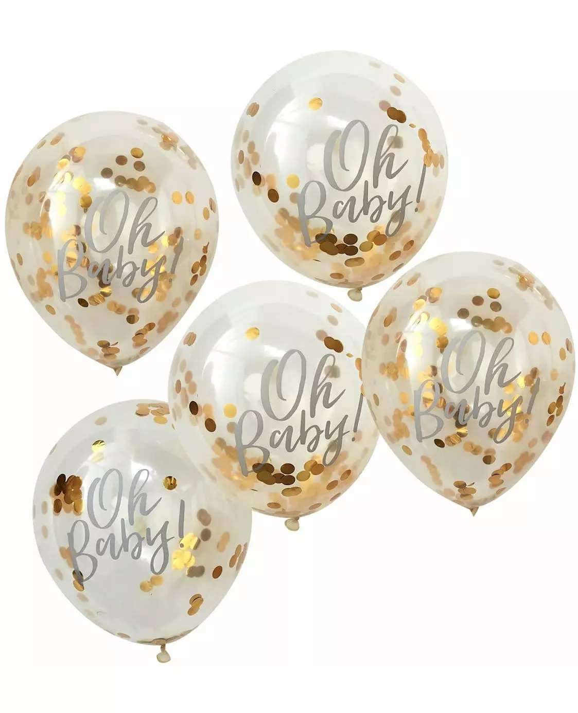 5 stk. Oh Baby klare metalliske gullkonfettiballonger 30 cm. Perfekte konfettiballonger til arrangementet ditt.
