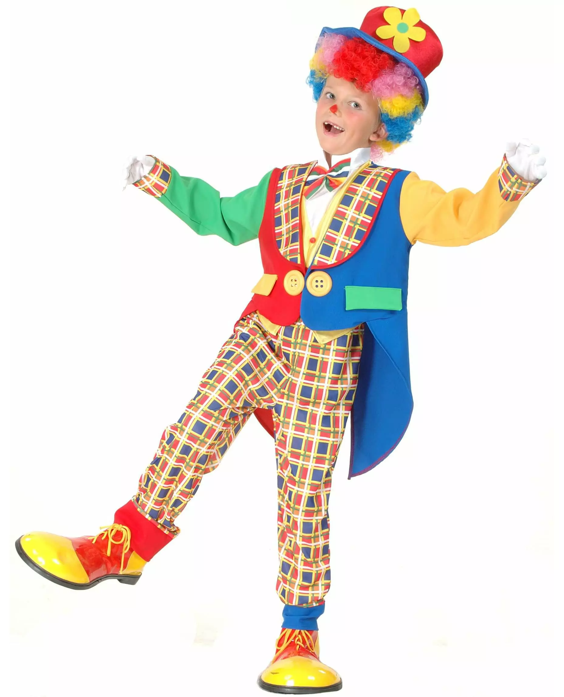 Sløyfe inkludert! Dette klovnekostymet for barn består av en flosshatt med blomst, en flerfarget jakke, en sløyfe sydd på toppen og matchende bukser. Dette fargerike klovnekostymet vil være ideelt for karneval eller andre sirkus-tema utkledningsarrangementer. Inkludert tilbehør: Lue, jakke, bukser, sløyfe. Materiale: 100 % polyester. Vedlikehold: Renseri. Målinformasjon: For størrelse 10/12 år: topp 41 cm bred ved bysten, buksene måler 85 cm lange og 23,5 cm brede.