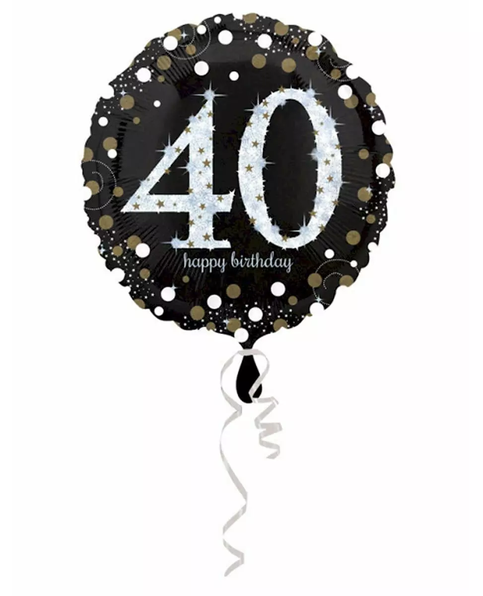 For en elegant 40-årsdagsfest Denne folieballongen med «happy birthday» måler omtrent 43 cm i diameter. Den er svart og har holografiske refleksjoner. Den er dekorert med tallet 40 som en påminnelse om 40-årsdagen. Meldingen «happy birthday» er ledsaget av et trykk av sølv- og gullprikker og stjerner. Trykket er dobbeltsidig. Den kan blåses opp med helium eller luft med et sugerør. Denne glitrende ballongen vil være perfekt for å fullføre bursdagsdekorasjonen din til 40-årsdagen din! Inkludert tilbehør: 1 ballong Materiale: Aluminium