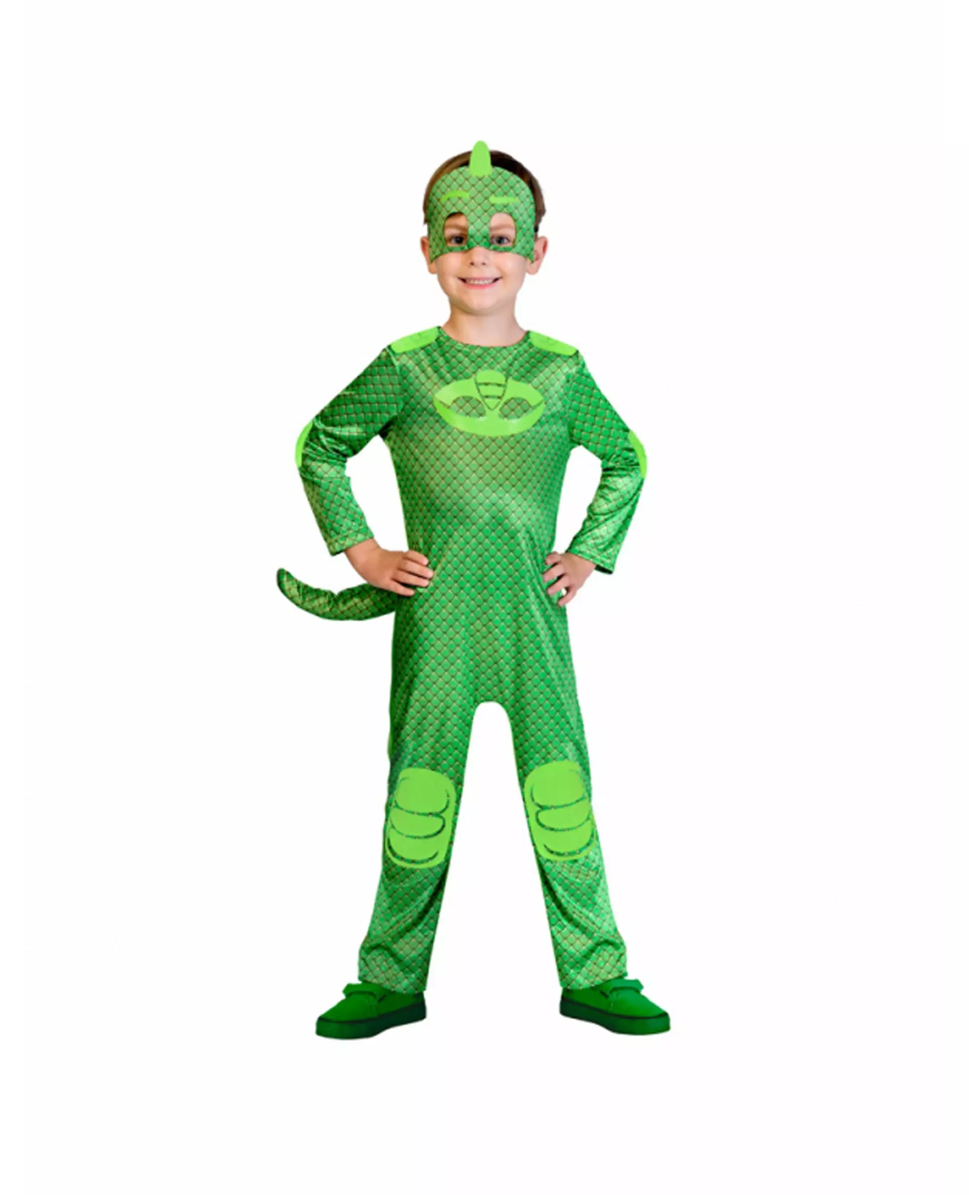 Mega Muskel Gluglu! Dette Gluglu-kostymet for barn er offisielt lisensiert av Pyjamasques &trade. Det består av en maske og en jumpsuit med hale. Den langermede jumpsuiten er helt grønn, med et logotrykk og skjellmønstre som representerer gekkohuden til Greg, denne superhelten med megamuskler elsket av de små. For en trofast gjengivelse er denne tegneserie-jumpsuiten også utstyrt med en grønn gekkohale. Masken representerer ansiktet til en øgle med klissete gekkoben og har to store åpninger i øyehøyde for god synlighet. Den vil være det essensielle tilbehøret for å opprettholde anonymitet i mørket! Med denne komplette forkledningen kan barnet ditt legemliggjøre sin favoritthelt og sikre barnas sikkerhet. for alles sikkerhet på bursdagsfester, kostymefester eller karneval!. Inkludert tilbehør: jumpsuit-maske Stell: Håndvask Målinformasjon: For størrelse 7/8 år måler jumpsuiten omtrent 108 cm lang og midjeomkretsen omtrent 38 cm.