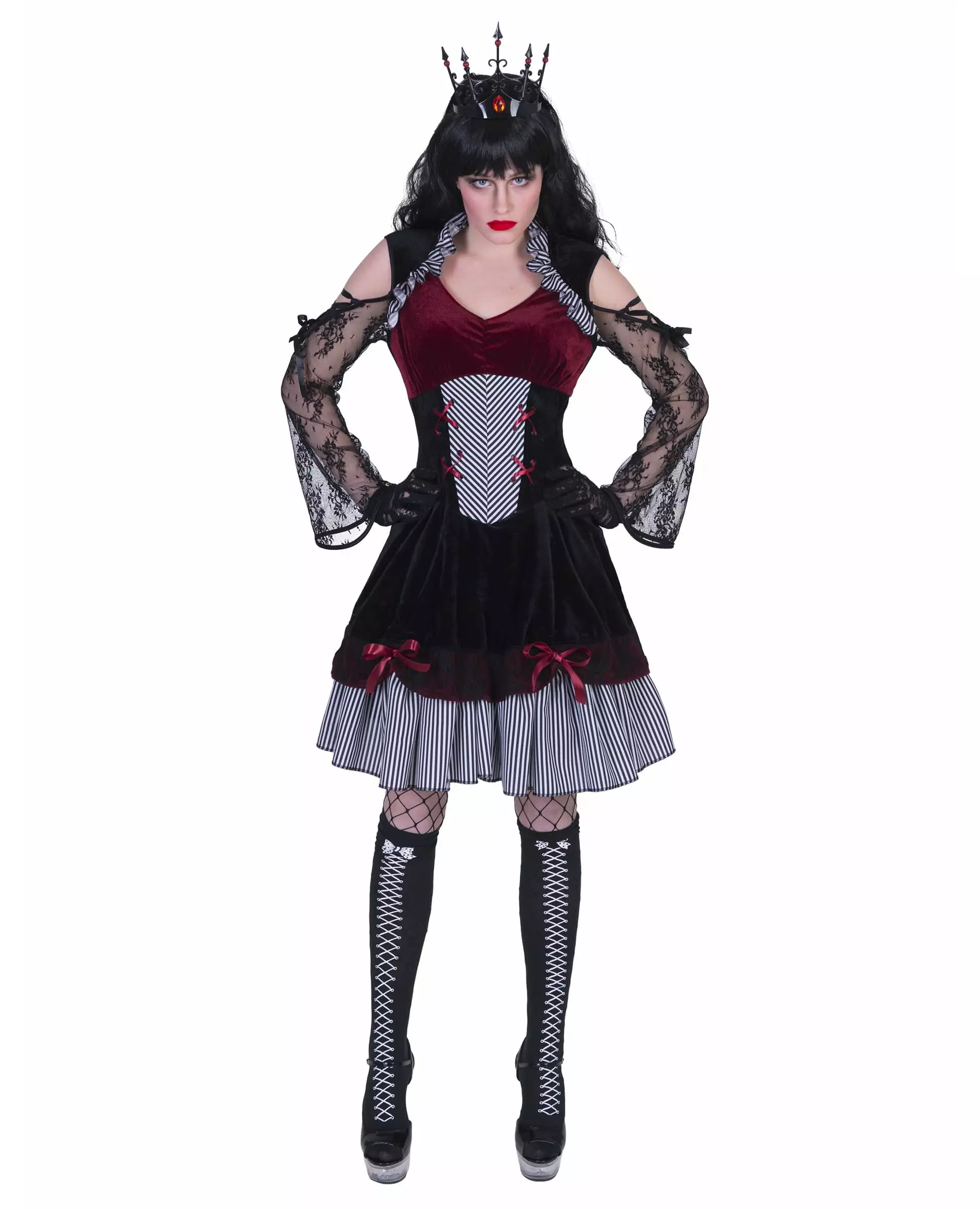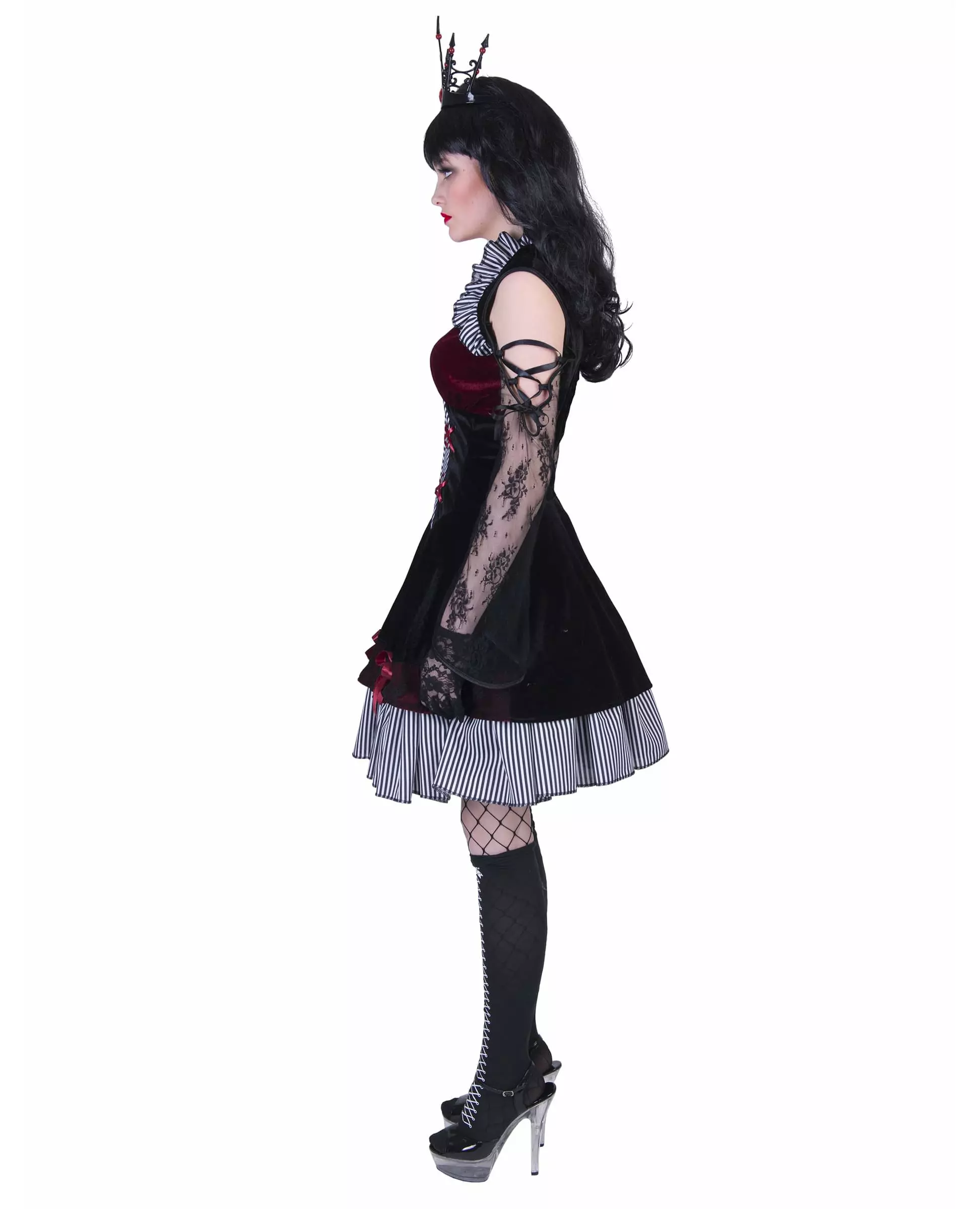 Et elegant gotisk kostyme Dette gotiske damekostymet er for kvinner. Det består av en kjole (strømpebukser, sko, parykk og krone er ikke inkludert). Toppen av kjolen har et imitert korsett og er svart fløyel på sidene og med svarte og hvite striper i midten. Den er dekorert med flere røde sløyfer. Ermene avslører skuldrene og er svart gjennomsiktig blonder. De er dekorert med et svart satengbånd. Nederdelen av kjolen er svart og rød med fløyelseffekt. Den er dekorert med en rød sløyfe, og bunnen har svarte og røde striper. Dette gotiske damekostymet vil være perfekt for å skremme gjestene dine på Halloween-festen din! Inkludert tilbehør: Kjole Materiale: 100 % polyester Vedlikehold: Håndvask