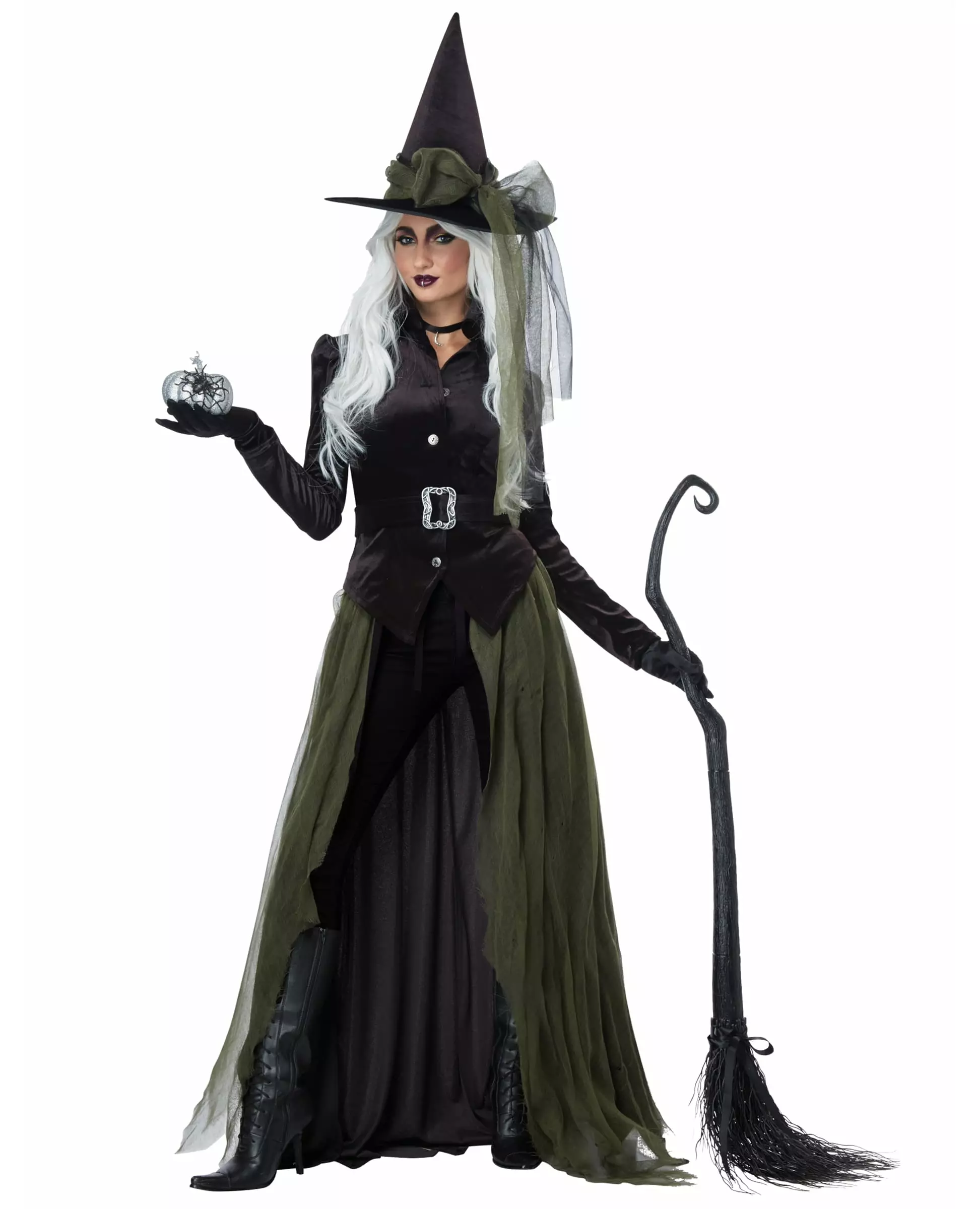 Et multifunksjonelt heksekostyme! Dette heksekostymet for voksne består av en hatt, en jakke, et belte og et langt skjørt. Den svarte satengjakken har lange ermer. Knapper og skjortekrage er på toppen. Et svart belte med sølvspenne fullfører jakken. Et langt khakigrønt skjørt er festet med et svart bånd foran. Det dekker bare baksiden av bena og avslører fronten. Dette skjørtet kan også brukes som en kappe. Til slutt vil en svart spiss hatt med khakigrønn tyll fullføre dette sublime kostymet. Gjør et plask med dette gotiske heksekostymet til Halloween!. Inkludert tilbehør: Jakke Belte Skjørt Hatt Materiale: 100 % polyester Vedlikehold: Håndvask