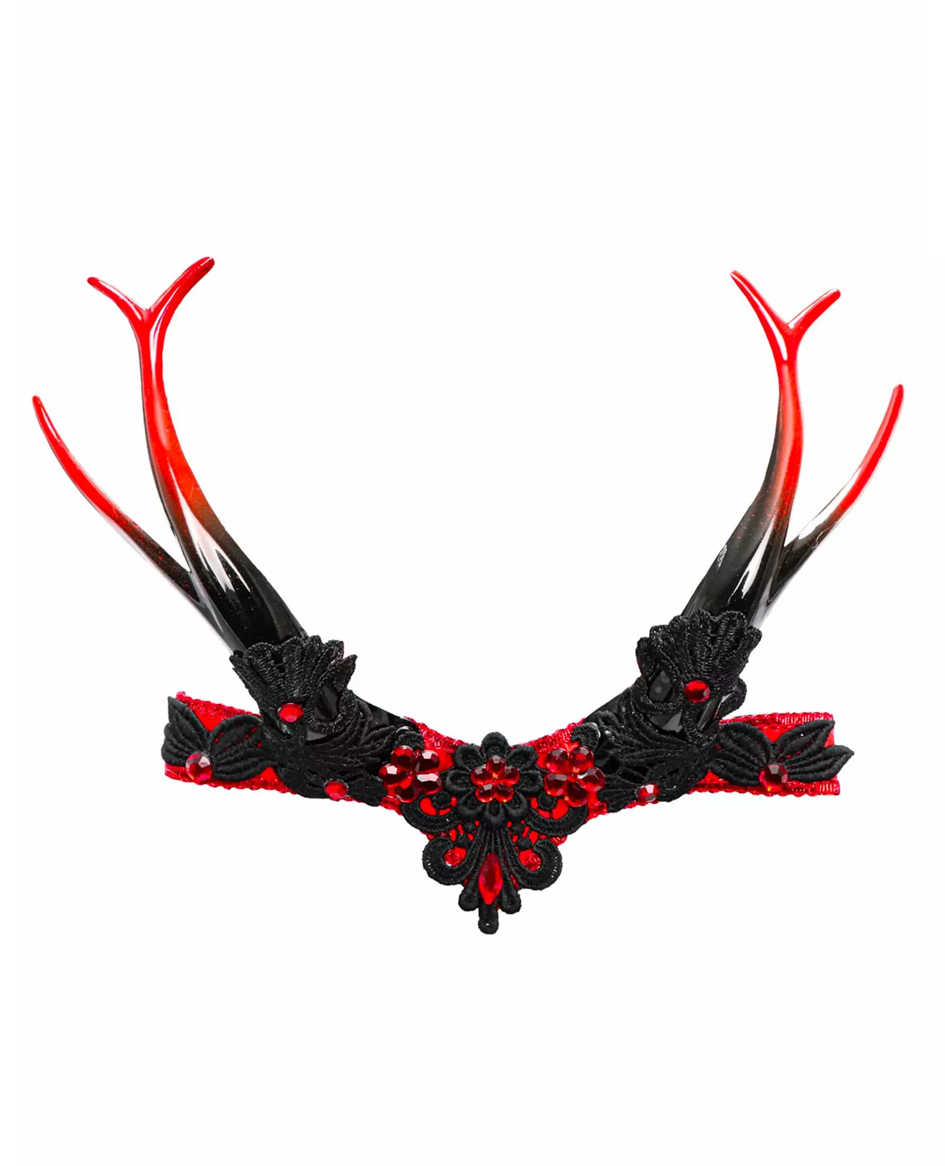 En original hodeplagg i gotisk stil. Denne gotiske hodeplaggen med horn er for kvinner. Basen på hodeplagget er et rødt stoffpannebånd med pene, svarte blomsterdetaljer og imitasjonsbroderi. Falske røde steiner gir hodeplagget sjarm. Til slutt er det to svarte og røde horn formet som hjortegevir. En elegant gotisk hodeplagg som tilbehør til et gotisk kostyme på Halloween-kvelden eller til en gotisk temafest. Inkludert tilbehør: Hodeplagg