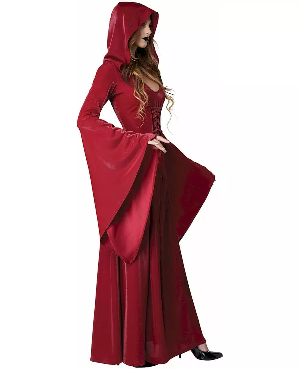 En elegant kjole til ditt djevelske arrangement! Dette røde gotiske kostymet er for kvinner. Det inneholder en kjole med hette. Den røde kjolen kjennetegnes av lange, utsvingte ermer. Den er dekorert med snøring foran og lar deg justere kjolen til kroppsfasongen din. Det er en hette på hele kjolen. Dette gotiske kostymet vil være ideelt for Halloween-kvelden din med venner! Inkludert tilbehør: 1 kjole med hette Materiale: 100 % polyester Pleie: Håndvask