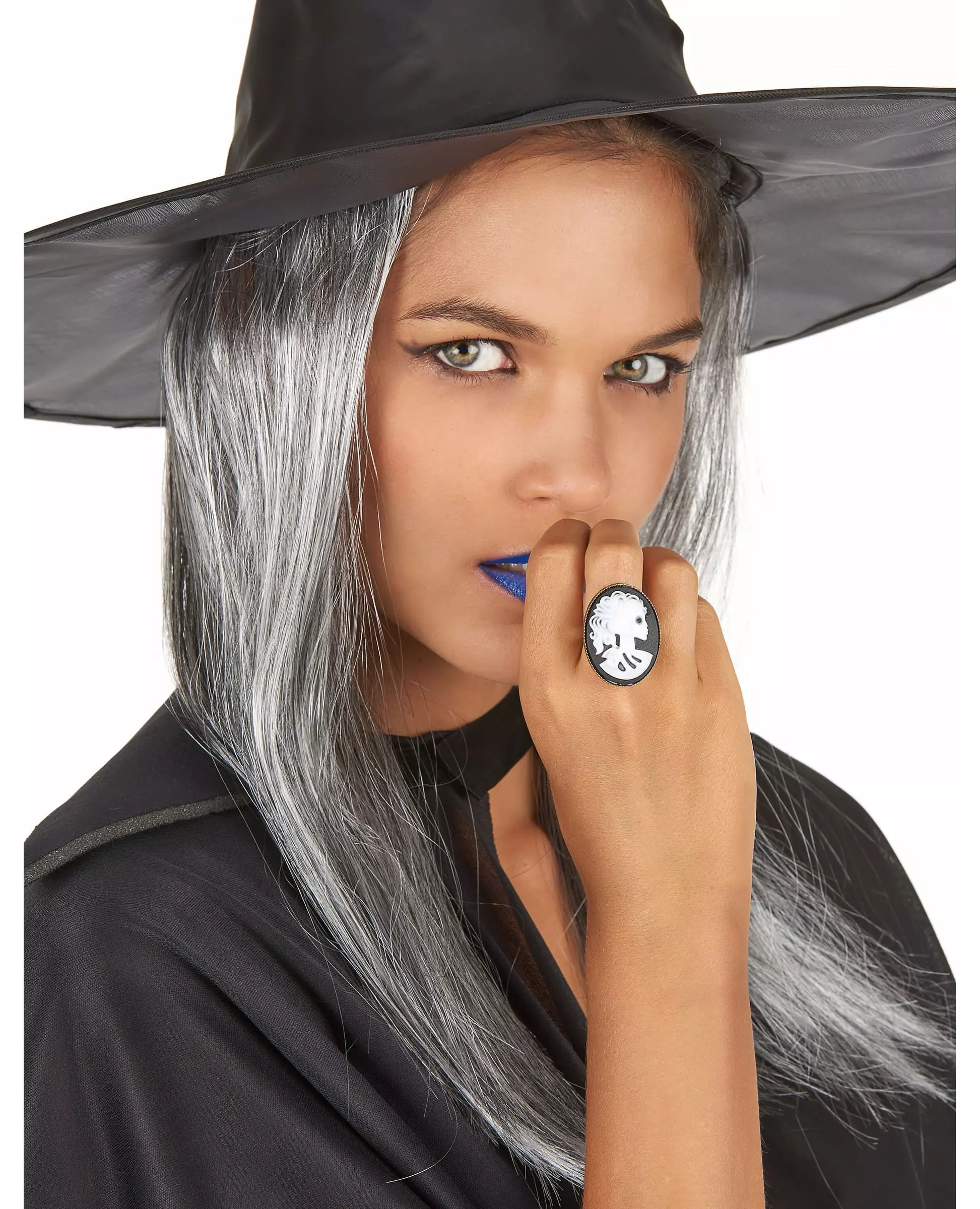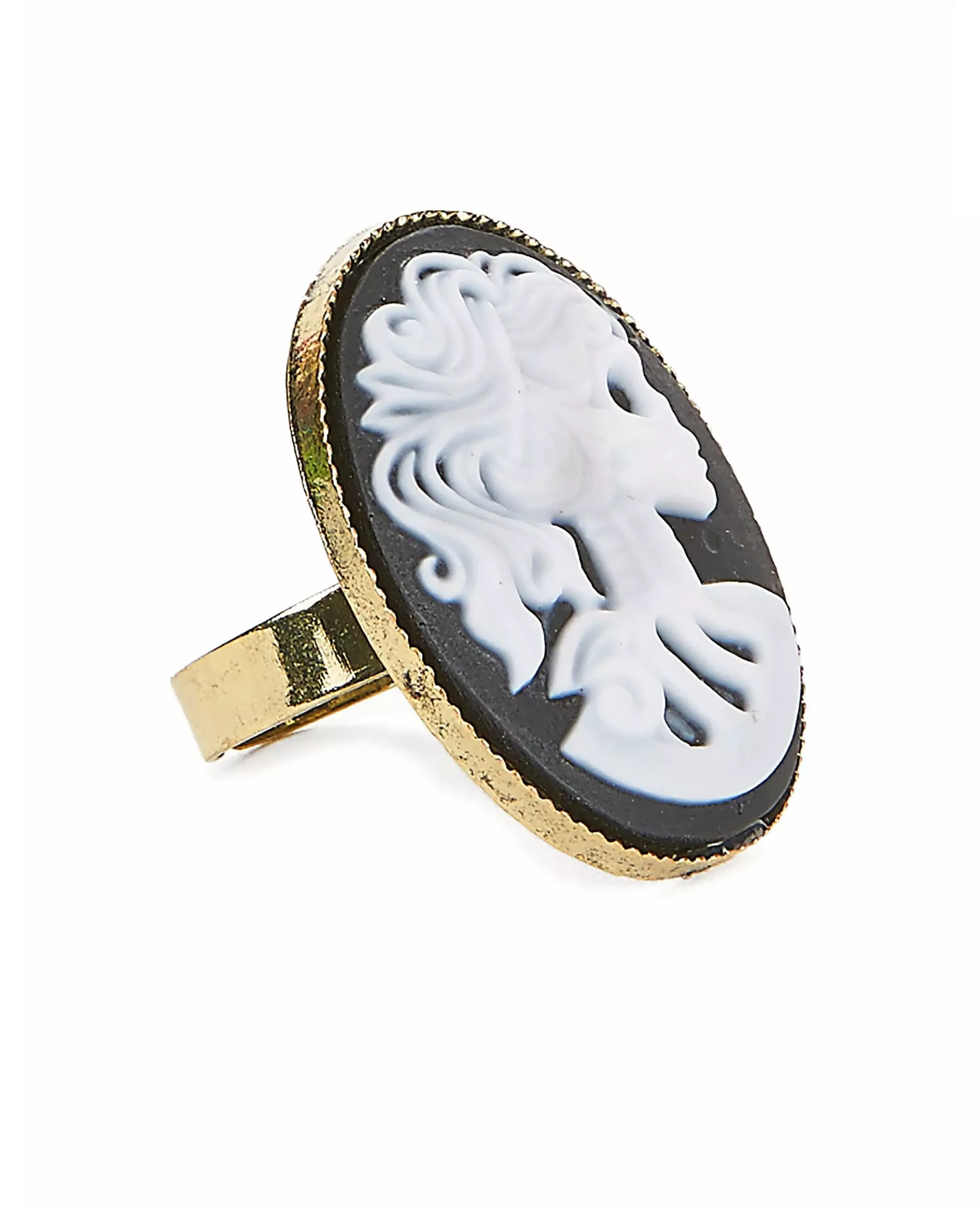 Et smykke som er like elegant som det er skummelt! Dette Halloween-tilbehøret er en gotisk skjelettring for kvinner. Denne justerbare jernringen er besatt med en 3,5 cm falsk stein som perfekt imiterer en svart kamee med et kvinnelig skjelettansikt på. Span rundt i en vampyrgrevinnekjole iført dette elegante og skremmende smykket på en stilig Halloween-fest! Inkludert tilbehør: Ringmateriale: Jern / Plast