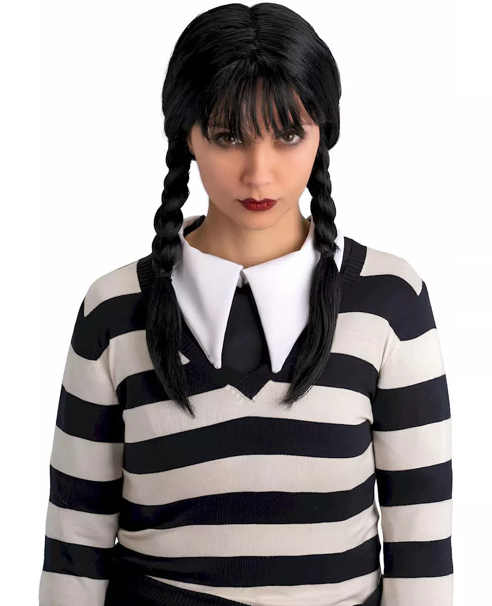 For et 100 % gotisk utseende! Denne flettede parykken er for kvinner. Parykken er svart i fargen, har to fletter og en lugg som vil pryde pannen din. Fullfør ditt gotiske utseende med denne svarte flettede parykken og ha det gøy med vennene dine på Halloween-fest! Inkludert tilbehør: Parykkmateriale: Syntetisk hår