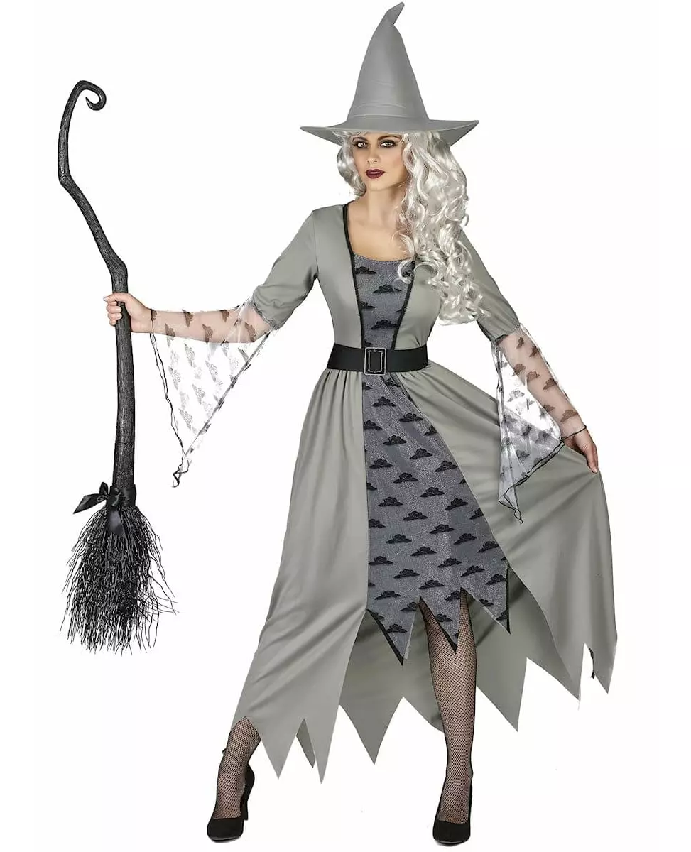 Den grå heksa! Dette heksekostymet for kvinner inkluderer en kjole, et belte og en hatt (kost, strømpebukser, parykk og sko er ikke inkludert). Kjolen, som er kortere foran, er lys grå. De lange, utsvingte ermene, samt forsiden av kjolen, er laget av hvit tyll med et svart skytrykk. Det tykke, svarte filtbeltet er knyttet bak. Dekorert med en sølvfarget plastspenne, vil den pynte livet ditt fint. Den grå hatten er laget av mykt skum. Den vil holde hodet ditt perfekt takket være metallrammen på kantene. (Hodeomkrets nær ca. 59 cm.) Dette Halloween-settet, for å si det mildt originalt, vil være perfekt for å skinne på kvelden med venner! Garantert suksess!. Inkludert tilbehør: Kjole Belte Hatt Materiale: 100 % polyester Stell: Håndvaskbar