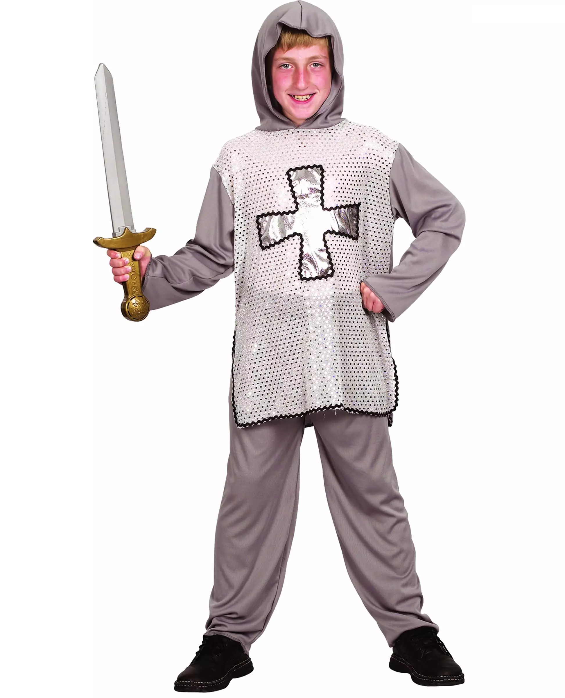 Lev som i middelalderen i dette ridderkostymet. Dette ridderkostymet for gutter består av en hettetopp og bukser (sverd og sko ikke inkludert). Den langermede toppen er grå. Den lysere brystkassen har store sølvpaljetter og et ridderkors foran. Korset er også sølvfarget. Denne toppen har også en grå hette som matcher ermene. Toppen har borrelåsfeste øverst bak for å gjøre den enklere å ta på. De grå buksene med strikk i livet fullfører dette modige ridderkostymet. Dette kostymet vil være perfekt for å dra av gårde for å befri prinsessen fra fangehullet hennes, til et show eller til karneval. Inkludert tilbehør: Topp Bukser Materiale: 100 % polyester Vedlikehold: Håndvask
