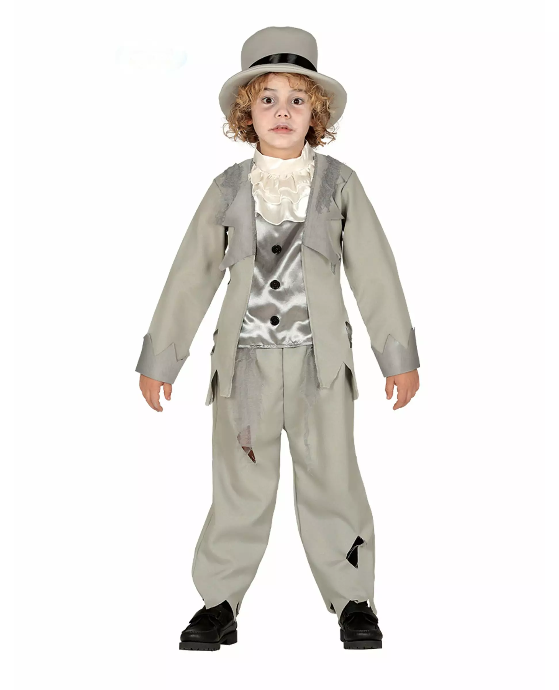 Et spøkelsesbrudgomkostyme til Halloween! Dette spøkelsesbrudgomkostymet for gutter består av bukser, jakke, skjorte, jabot og hatt (sko ikke inkludert). Buksene og jakken er grå med rifter. Jakken har lysere grå slag. Skjorten er grå, i satengstoff, med en hvit jabot. Hatten er grå med et svart bånd nederst. Gjør sønnen din til en ekte spøkelsesbrudgom til Halloween!. Inkludert tilbehør: Bukser Jakke Skjorte Jabot Hatt Materiale: 100 % polyester Vedlikehold: Håndvask