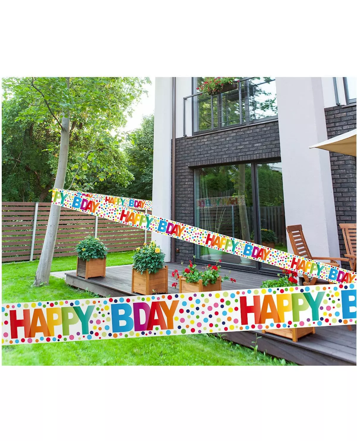 Det er festtid for bursdagen din! Dette bursdagsbanneret måler omtrent 15 meter i lengden. Det er hvitt med fargede prikker og meldingen «Gratulerer med dagen» i flerfargede bokstaver. Dette banneret vil være perfekt for å fullføre bursdagsdekorasjonen din. Inkludert tilbehør: 1 banner