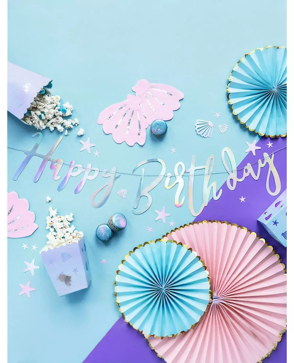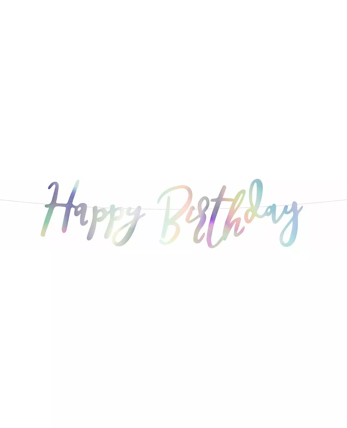 En iriserende girlander til bursdagen din! Denne pappgirlanderen måler omtrent 62 cm lang og 16,5 cm høy. Den har ordene «Gratulerer med dagen» i iriserende toner, noe som gir en lys og festlig effekt. Den er enkel å henge opp takket være de forhåndsstansede endene, og vil være perfekt for å lage en lys og moderne bursdagsdekorasjon. Inkludert tilbehør: 1 girlander Materiale: Papp