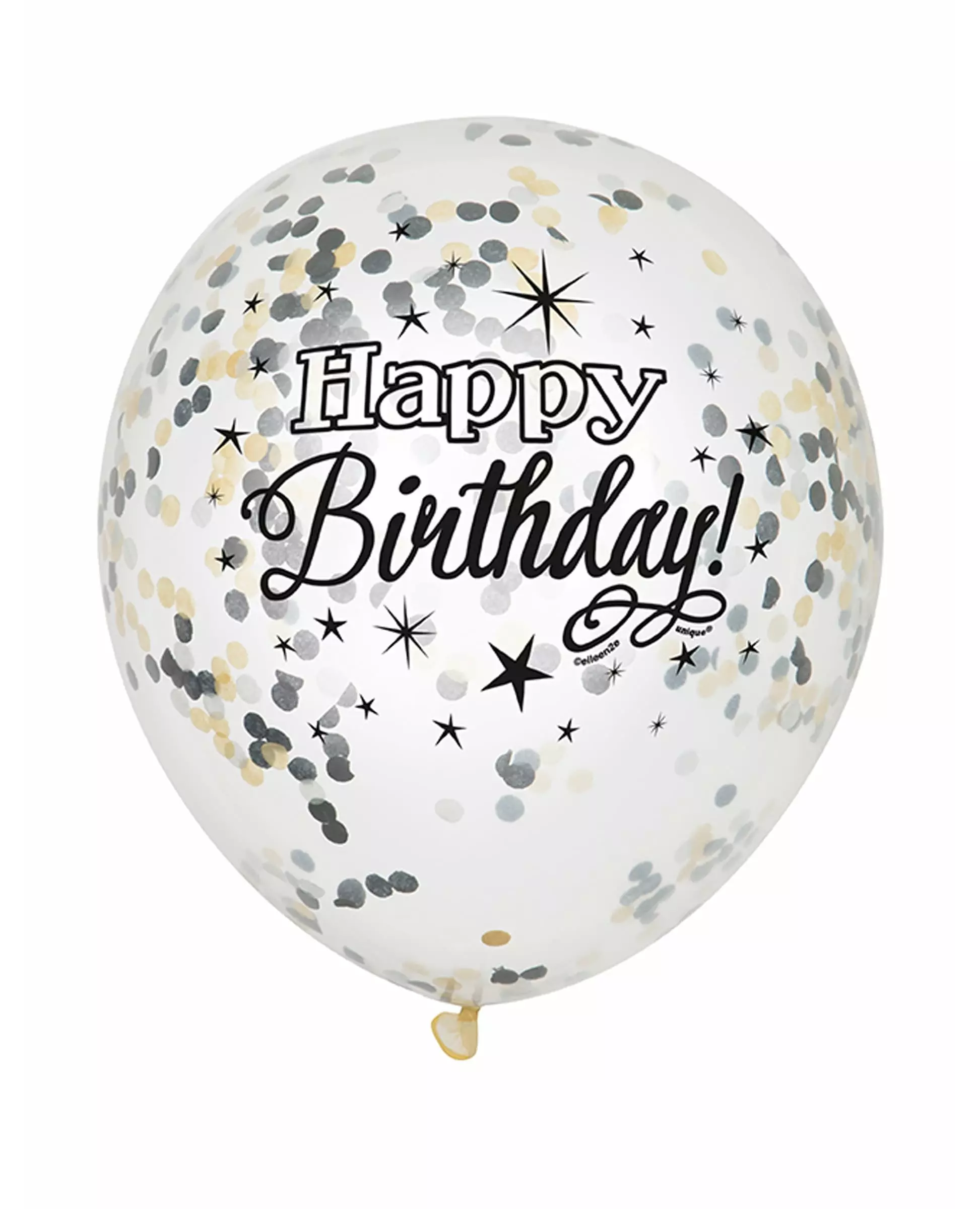 Ballonger som glitrer! Dette settet inneholder 6 bursdagsballonger, en pose med konfetti og en trakt av papp. Disse ballongene er laget av naturgummilateks og er biologisk nedbrytbare. De er gjennomsiktige og har teksten «Gratulerer med dagen» påtrykt. Når de er oppblåst, måler de omtrent 30,5 cm (det anbefales å blåse dem opp med en pumpe). Posen inneholder omtrent 14 g svart, sølv og gull konfetti. Bruk trakten til å skyve dem inn i ballongene før du blåser dem opp. Disse konfettiballongene vil være perfekte for å fullføre romdekorasjonen din til en bursdagsfest. Inkludert tilbehør: 6 ballonger 1 trakt 1 pose med konfetti Materiale: Naturgummilateks, papir, papp
