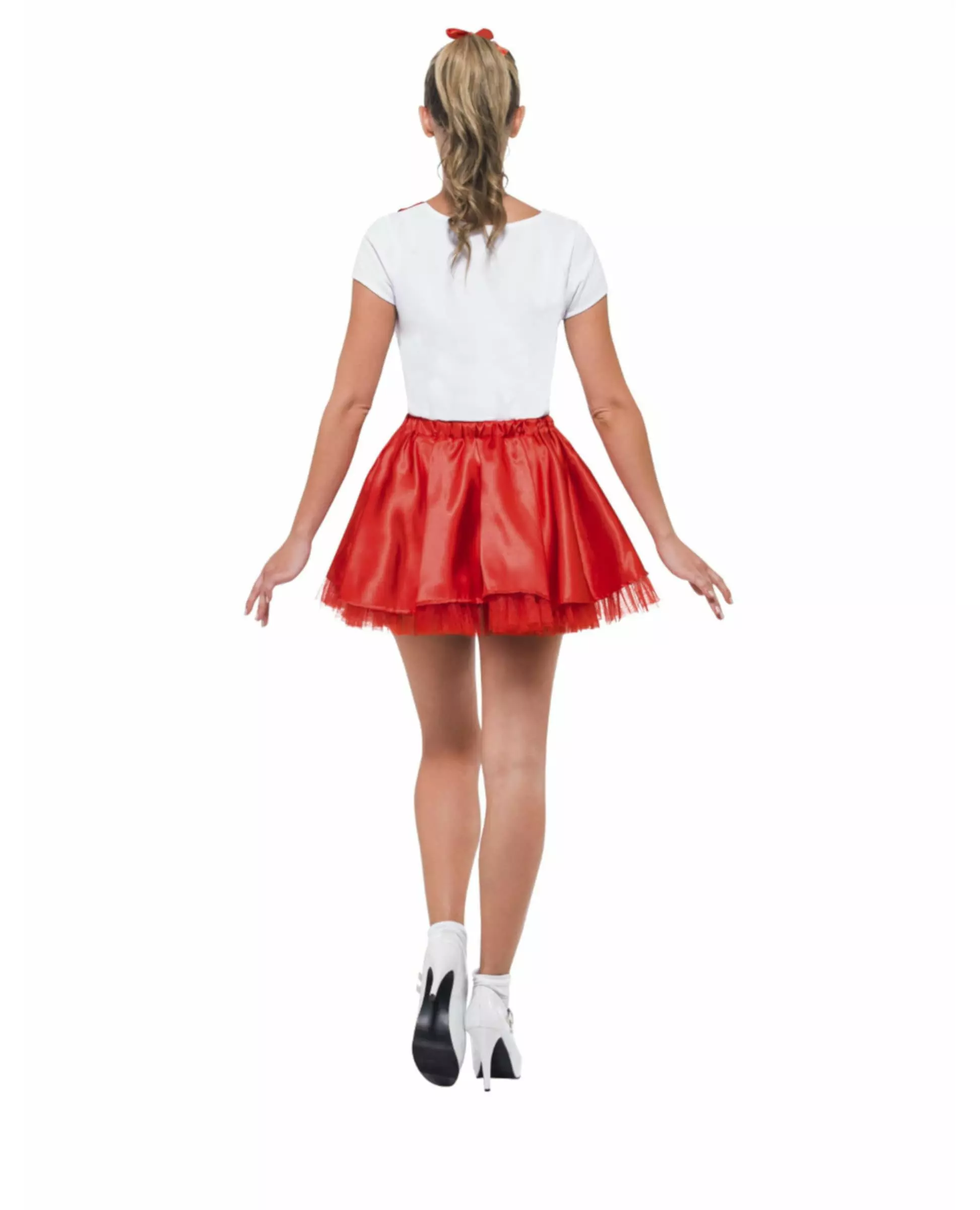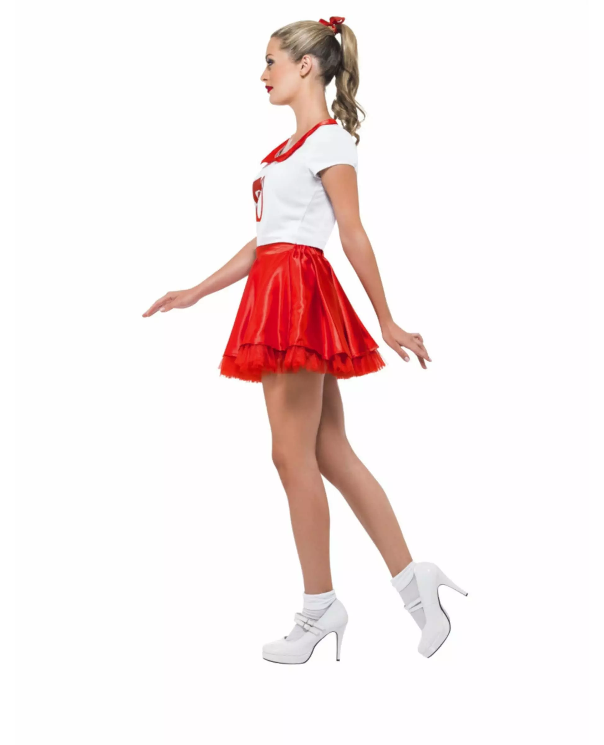 Grease-fan, velg dette cheerleader-kostymet! Dette cheerleader-kostymet for kvinner er offisielt lisensiert av Grease™. Det består av en topp og et skjørt (sokker og sko er ikke inkludert). Den kortermede toppen er hvit med en rød krage. En stor rød R er også trykt foran. Skjørtet er rødt med et tyllbånd nederst. Dette kostymet lar deg sette deg inn i Sandys sko på en Grease-temafest. Inkludert tilbehør: Topp Skjørt Materiale: 100 % polyester Vedlikehold: Håndvask