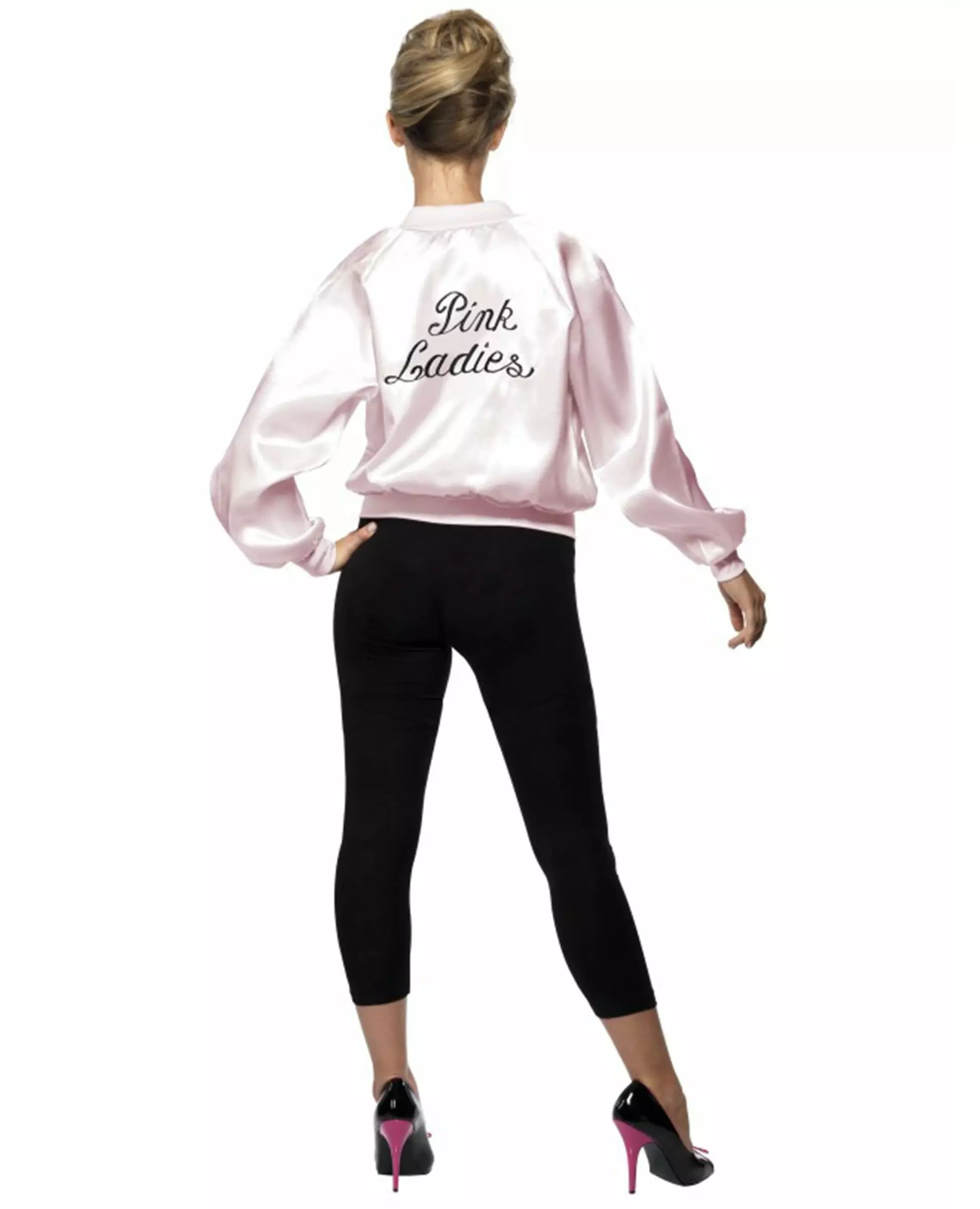 Brodert logo! Dette «Pink Ladies» Grease-kostymet for kvinner består av en satengrosa jakke med inskripsjonen «pink ladies» brodert på brystet og ryggen. Den har glidelås (kun jakken er inkludert). Dette kostymet vil være ideelt for temafester eller andre utkledningsarrangementer. Inkludert tilbehør: Jakke Materiale: 100 % polyester Rens: Kemisk rens