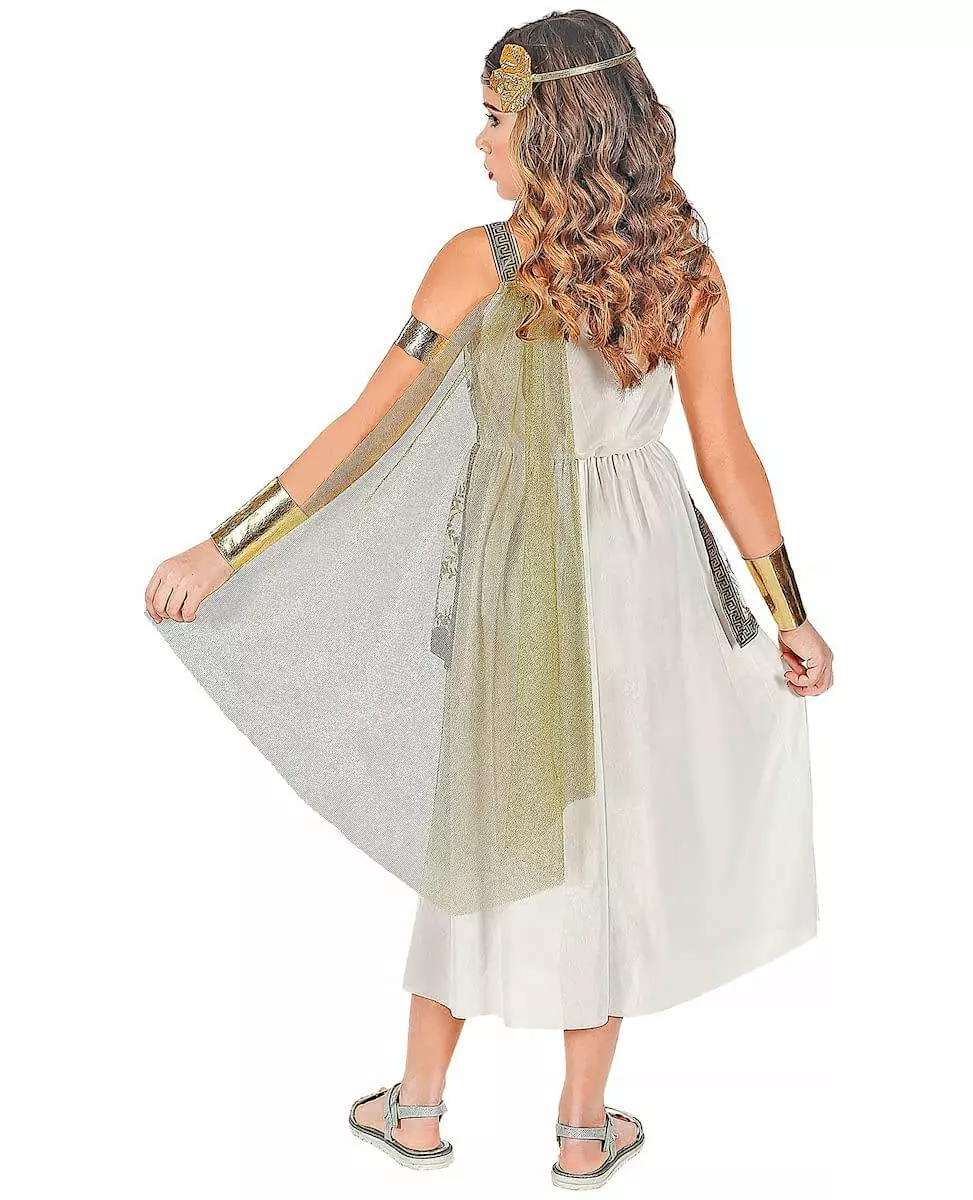Datteren din vil være den vakreste gudinnen i denne eldgamle kjolen. Dette greske gudinnekostymet for jenter består av en kjole med drapering og en laurbærkrans (sko ikke inkludert). Den ermeløse kjolen er hvit, med et slør med et laurbærkvadratisk mønster på toppen. Det er også drapering på skulderen. Et pannebånd fullfører denne pene kjolen. Den er gyllen med falske blader på sidene. Dette kostymet vil gjøre datteren din til en stor gudinne fra den greske antikken til karnevalet. Inkludert tilbehør: Kjole, pannebånd, Materiale: 100 % polyester,