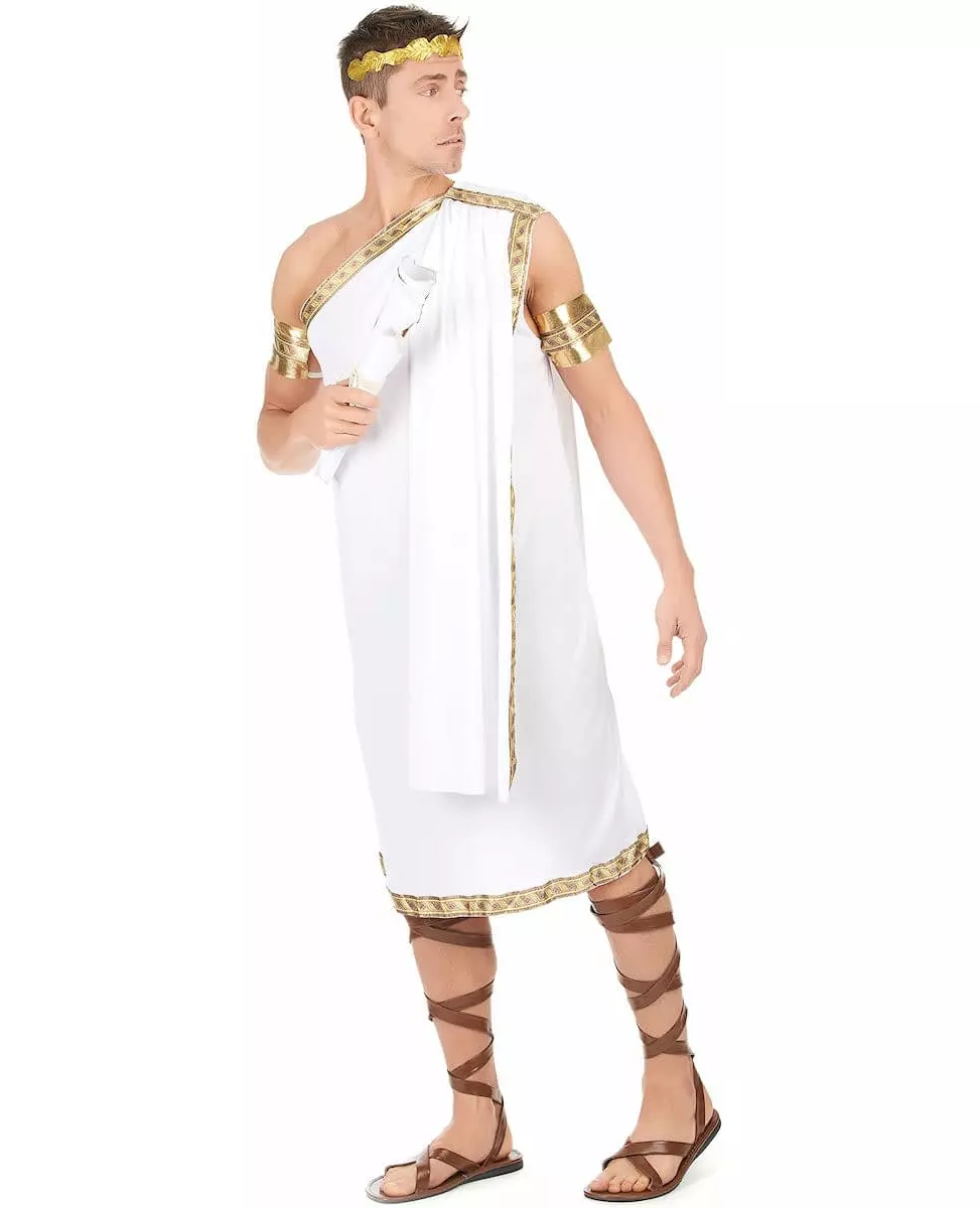En innbygger hjemvendt fra antikkens Hellas! Dette greske kostymet for menn består av en tunika, to armbånd og en krone. Den ermeløse tunikaen er hvit og har gulldetaljer nederst samt en asymmetrisk øvre del. En kappe er sydd på skulderen. De gylne armbåndene er justerbare med borrelås. Kronen er laget av syntetiske gylne blader festet til et pannebånd. Dette greske kostymet er perfekt for utkledningsfester og karneval. Inkludert tilbehør: Tunika med kappe, to armbånd, krone. Materiale: 100 % polyester. Vedlikehold: Håndvask.