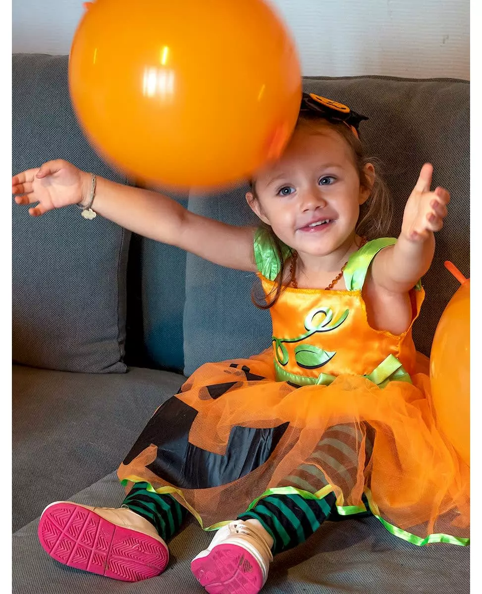 Søtt til Halloween! Dette gresskarkostymet for jenter består av en kjole og et pannebånd (strømpebukser og sko er ikke inkludert). Den pene ermeløse kjolen er oransje. Trekkene til et smilende gresskar er trykt i svart. De tynne stroppene er grønne. En svart tyllkant pryder kragen. Midjen er markert av et grønt belte med små svarte prikker og en sløyfe. Bysten er dekorert med grønt løvverk som minner om toppen av gresskaret. Skjørtet er utslengt, og en grønn kant fullfører bunnen av antrekket. Et oransje og svart gresskar er festet til det oransje pannebåndet. Velg dette gresskarkostymet. Datteren din kommer til å bli så søt!. Inkludert tilbehør: Kjolepannebånd Materiale: 100 % polyester Vedlikehold: Håndvask
