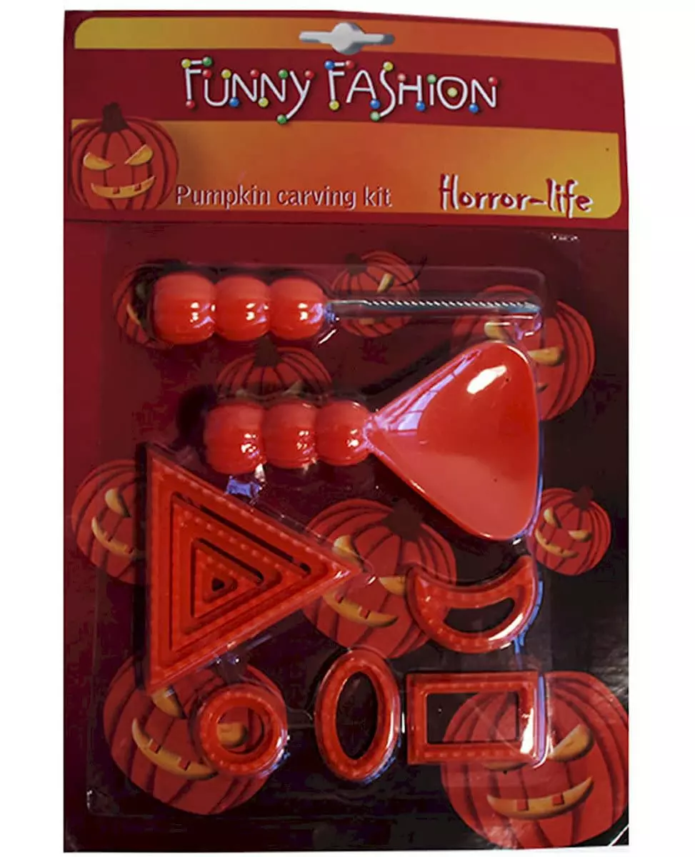 La fantasien løpe løpsk. Dette utskjæringssettet inneholder mye oransje plasttilbehør for å skjære ut et gresskar. Takket være dette settet er det mulig å lage et personlig gresskar. Du kan faktisk velge formen på øyne og nese mellom forskjellige geometriske former: trekant, halvmåne, rund, oval... Kniven og slikkepotten som følger med, lar deg tømme gresskaret og gi det en vakker finish. Dette tilbehøret vil være perfekt for å lage din egen dekorasjon til Halloween-kvelden 31. oktober. Inkludert tilbehør: Kniv Slikkepott 7 kakeutstikkere Materiale: Plast