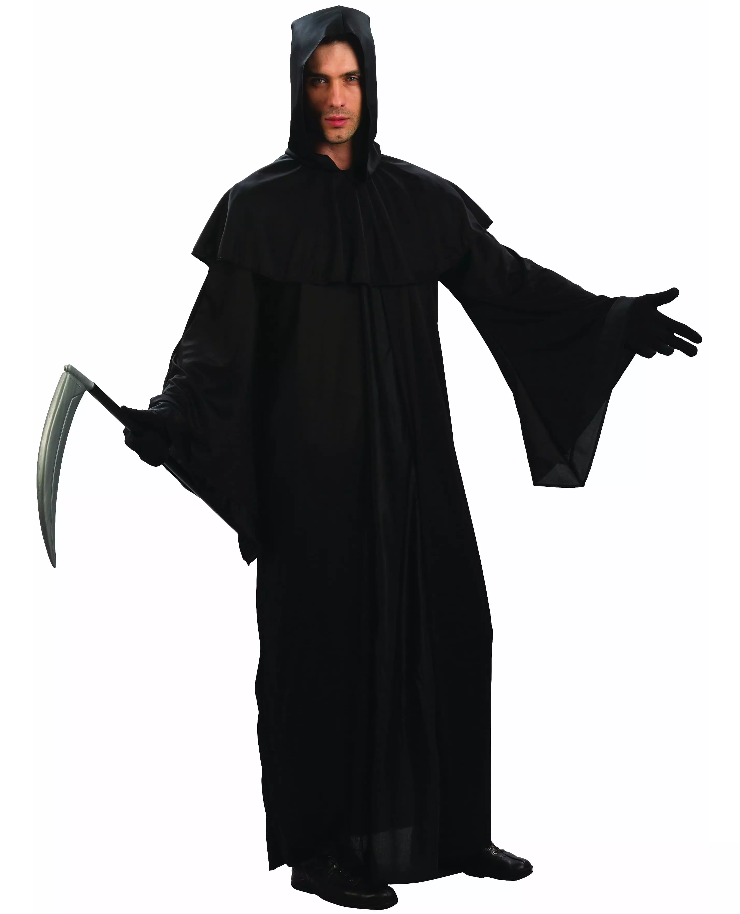 Skremm vennene dine i dette svarte Grim Reaper-kostymet. Dette Grim Reaper-kostymet for menn består av en kjole og en hette. Den lange kjolen er svart med utsvingte ermer. En tynn stripe med litt skinnende svart stoff finnes i midten av kjolen. Denne kjolen knytes på baksiden med to knytebånd. En hette vil fullføre dette skremmende kostymet. Denne hetten peker på baksiden og er utstyrt med en liten kappe som faller på skuldrene. Dette kostymet vil være perfekt for å legemliggjøre Grim Reaper i for en skrekk-tema fest eller for å feire Halloween. Tilbehør inkludert: Kjole med hette Materiale: 100 % polyester Pleie: Håndvask