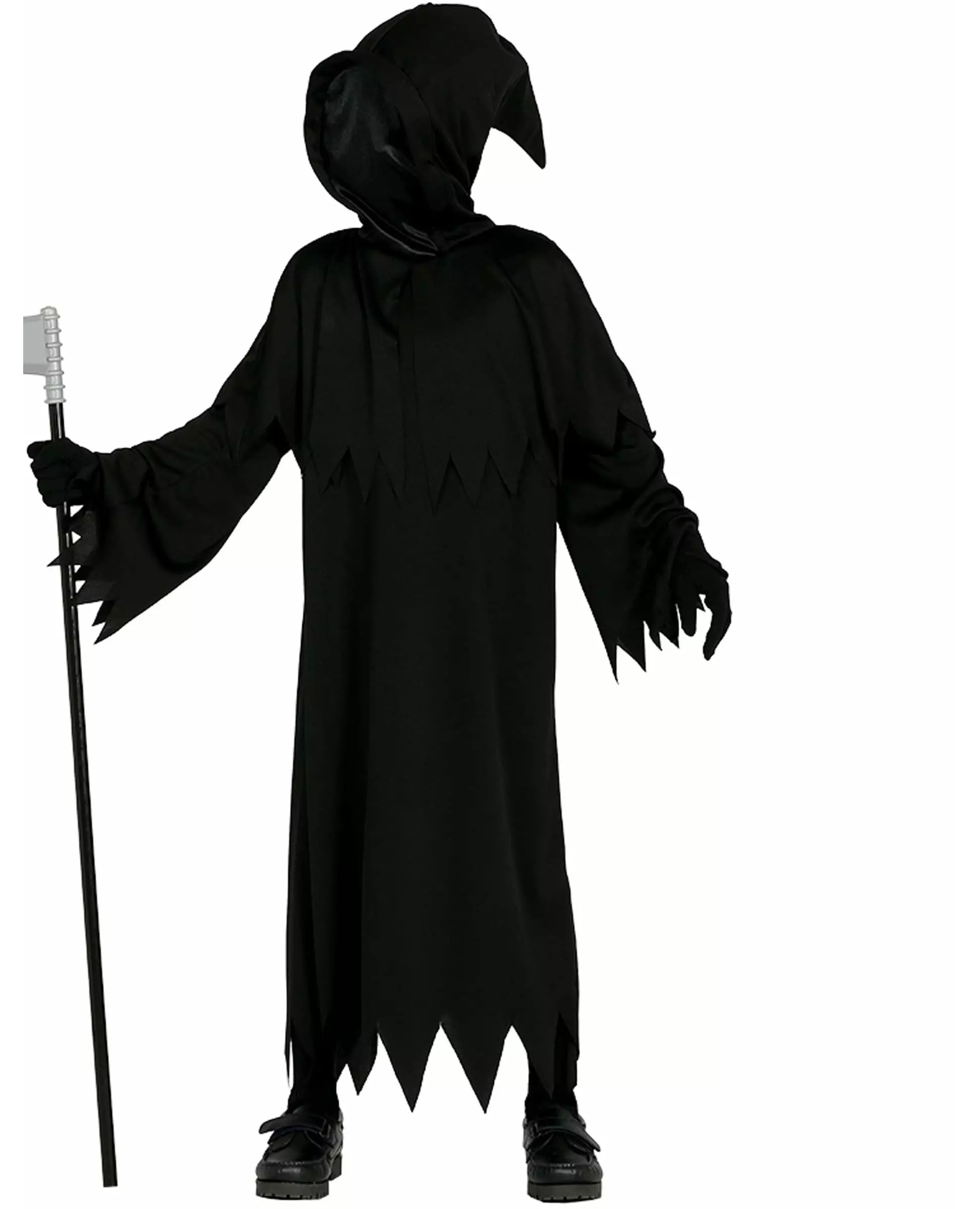En dødelig forkledning! Dette Grim Reaper-kostymet er for barn. Det inkluderer en tunika og en hette med en integrert balaklava (ljå, hansker og sko er ikke inkludert). Tunikaen, helt svart, er taggete på endene av armer og ben. De lange ermene er utsvingte for å forbli trofaste mot denne skremmende inkarnasjonen av død! En hette settes på tunikaen og lukkes foran for å skjule barnets ansikt. Stoffet er gjennomsiktig for å sikre god synlighet. Denne hetten faller også til et punkt på torso og rygg, slik at ingenting av barnets kropp er synlig. Inkludert tilbehør: balaklava-tunika Materiale: Polyester Stell: Håndvask