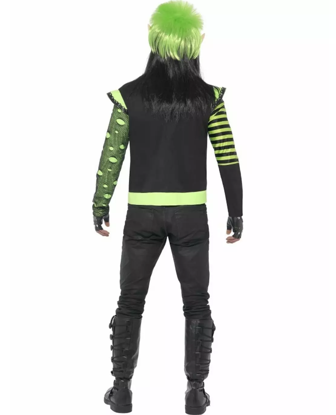 Ikke gå ubemerket hen på utkledningsfestene dine med denne gotiske jakken. Denne gotiske alvejakken for menn er grønn og svart (kun jakken er inkludert). En asymmetrisk glidelås gjør den enkel å bruke. Små ermer dekorert med svart kunstskinn fremhever skuldrene. Venstre erme er grønt med et stort svart netting over. Høyre erme er stripete i grønt og svart. Nederdelen av jakken er fremhevet av et falskt belte, som lukkes med en stor svart plastspenne. Denne jakken vil være perfekt for å fullføre ditt punk- eller gotiske antrekk til en utkledningsfest med venner eller til Halloween. Inkludert tilbehør: Jakke Materiale: 100 % polyester Pleie: Håndvask