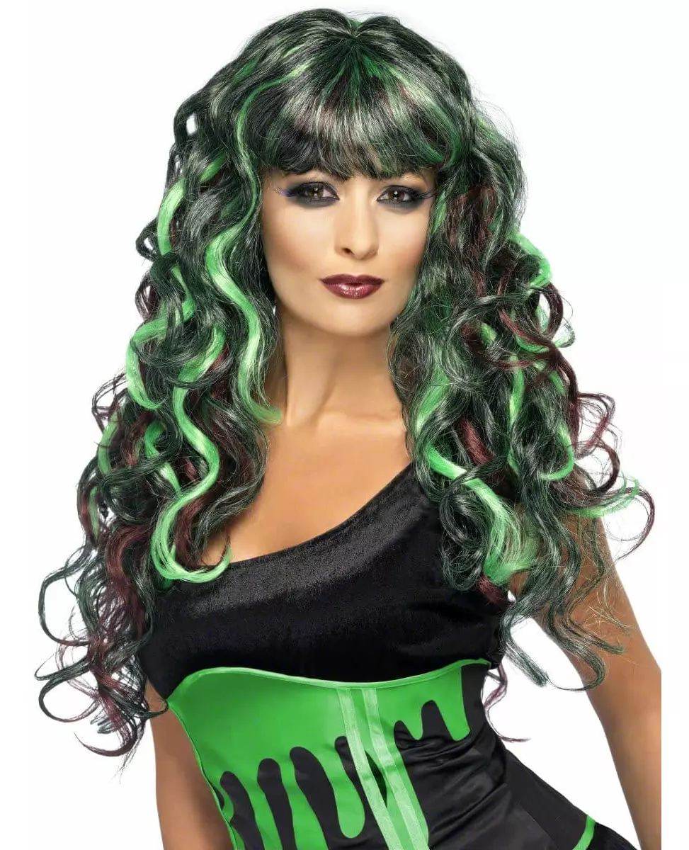 Vakre krøller! Denne havfrueparykken med frynser til voksne, med langt og krøllete hår, i nyanser av grønt og svart, vil være ideell for å fullføre kostymet ditt under karneval, eller for eksempel under en temafest. Materiale: syntetisk 100 % polyetylen 100 % polyetylen