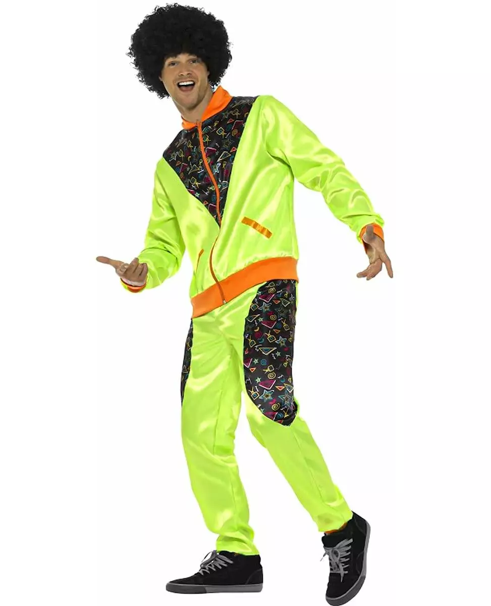 Et fantastisk retroantrekk! Dette kostymet er en retro joggedress for menn. Den inkluderer en jakke og bukser. Jakken er laget av grønt satengstoff. Den lukkes med en oransje glidelås foran. Endene av ermene, kragen og bunnen av jakken er fluorescerende oransje. To falske oransje lommer er også plassert foran. Ved kragen er det et svart panel dekket med forskjellige fargerike trykte mønstre. Joggebuksene er også laget av grønn sateng. De er elastikk i midjen og har svarte paneler med fargerike mønstre på bena. Bunnen av buksene er oransje og elastikk. Dette retrokostymet vil gjøre deg til en virkelig nerdete mann som får vennene dine til å le på karnevalet! Inkludert tilbehør: Jakke Bukser Materiale: 100 % polyester Pleie: Håndvask