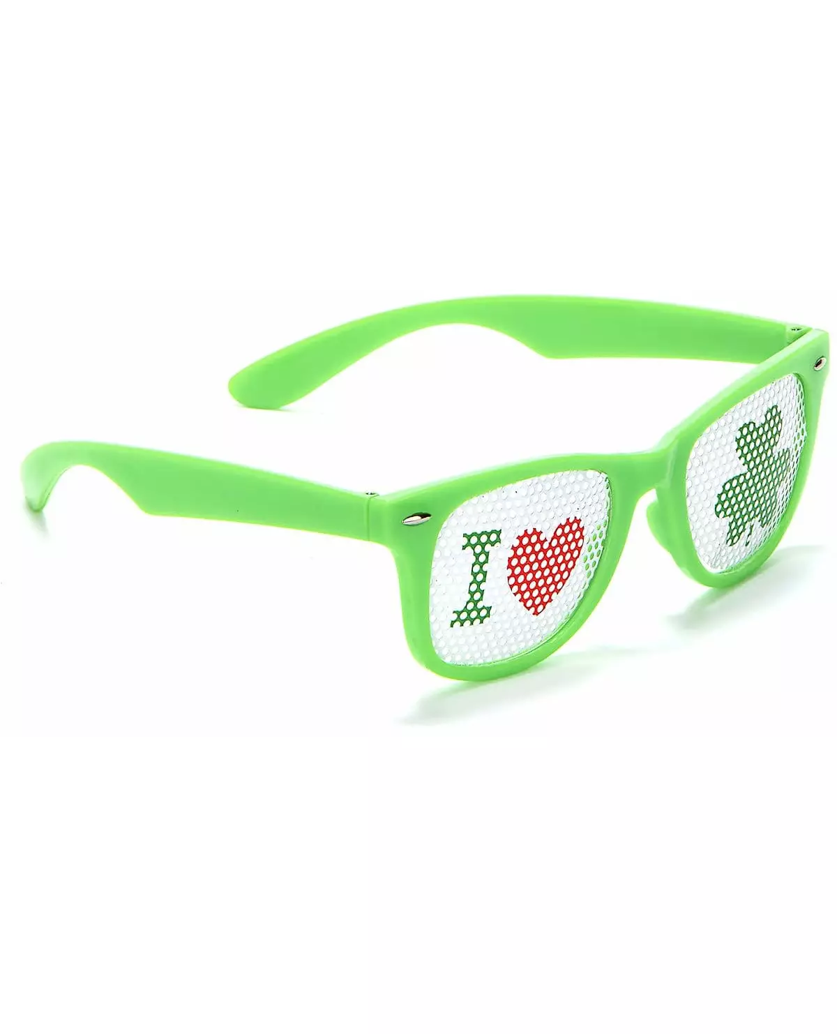 Vis dine preferanser! Disse brillene for voksne er laget av plast. Innfatningen er fluorescerende grønn med hvite linser som gjør at du kan se komfortabelt takket være hullene på hele linseoverflaten. Det er en inskripsjon på begge linsene, nemlig et «jeg», et «hjerte» og et «kløver» som betyr «jeg elsker Irland». Du vil garantert være moteriktig med disse moderne brillene! Til glede for en St. Patricks dag-kveld! Inkludert tilbehør: Briller Materiale: Plast