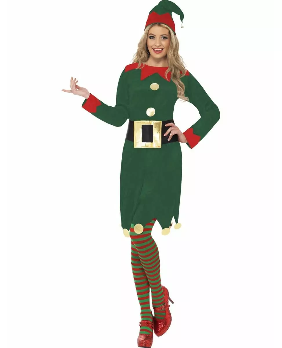 Jobb sammen med julenissen Dette julenissekostymet for kvinner består av en kjole, et belte og en lue (strømpebukser og sko er ikke inkludert). Den grønne kjolen med filteffekt har falske gullknapper på bysten. Den er kuttet i spisser nederst og har en elastisk midje. Kragen og mansjettene er dekorert med rødt stoff kuttet i spisser. Et bredt svart stoffbelte fremhever midjen. Den har en stor gullspenne og lukkes foran. Til slutt vil en spiss lue med bjelle sette prikken over i-en til dette kostymet. Dette kostymet vil være perfekt for å leke julenissens alv under slutten av året. Inkludert tilbehør: Kjole Belte Lue Materiale: 100 % polyester Vedlikehold: Håndvask